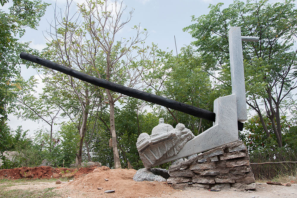 Mr. Ullas heals from Mysore, who has pursued Bachelor Degree in Visual Arts at Chamarajendra Academy of Visual Arts in Mysore and Master Degree in Visual Arts in Bangalore University. Mr. Basavaraj Metri is also an artist who has pursued Bachelor and Master Degree in Fine Arts. Two young and energetic artisans collaborates and works on a social cause faced by the people in that place. They highlight a farmers struggles and depicts anger of the farmer vigorously in the sculpture by visualizing the ploughing of a very famous government structure “Vidhana Soudha” were the state legislature takes place. This sculpture is successfully made with the help of the assistance of Mr. Jaghadeesh and Mr. Sandeep Mandya. This sculpture consists multiple mediums along the stone.