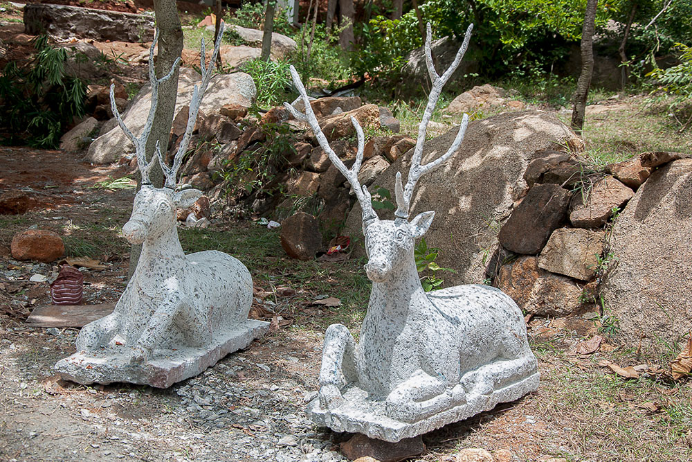 Mr. Vinay and Mr. B Krupendra are trained artisans in the same field, engaged in their assisted work of making an arch for the place Aadima. The arch contained old stone pillars of a demolished church in Kolar. The arch is designed in a concept of calm, peace and life, were it consists of two deers, Buddha chakra etc. The deers speaks of the history of the place and existence of the animal on its own in the place previously. The Buddha chakra is an iconography representing the Dharma “Moral Social duty, religious values and the way of living” is placed in the center of the arch top insisting peace around oneself. The pillars are installed in box frames with the help of the crane, and the cement mixture is poured into the box frame to bind the pillar to the place. The deers are carved on the soap stone brought from Mysore by Mr. Vinay and Mr. B Krupendra with the help of various chisels and machineries. The horns of the deer was difficult to obtain from the stone because of the size of it has to be small. Hence the horns were made out of resin mixture, stone powder and wire armature by Mr. Pushparaj. The Buddha chakra was carved by Mr. Anandraju M, Mr. B Krupendra and Mr. Revanna Parasappakenchappagola.