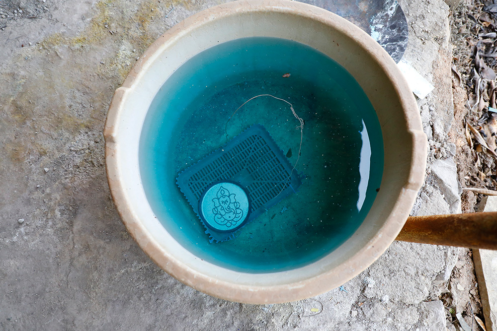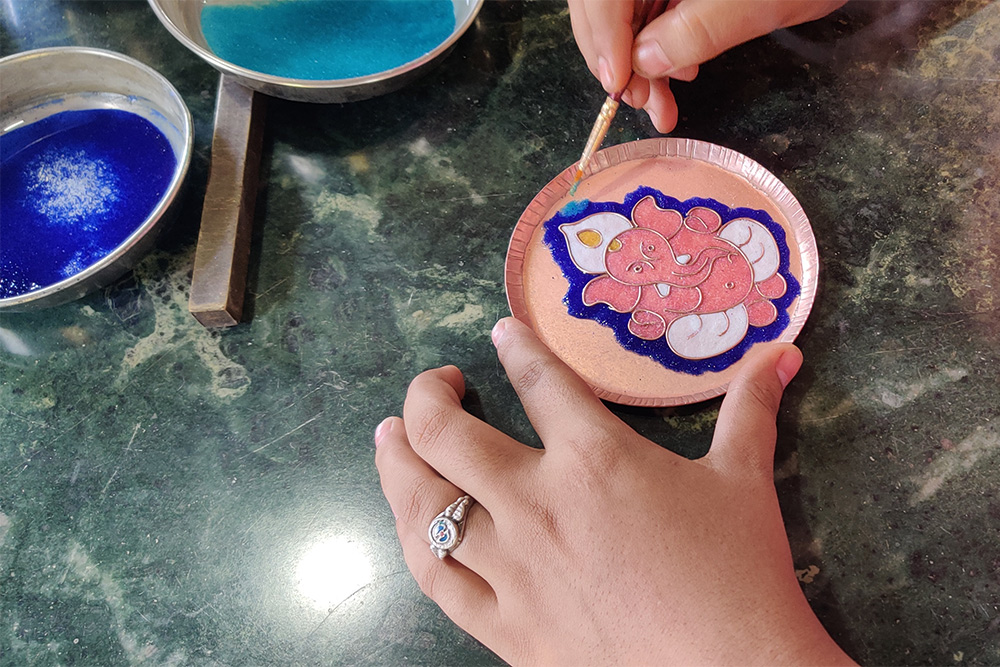 The colour glass powder is made by crushing colour glass stones using a Kandap machine. The glass powder is mixed with water to make it wet. This wet glass powder is now put on the design by using a brush. Bright and eye-catching colours are used for painting. Once the painting is done excess water on the surface is tipped using a cotton cloth. The cotton cloth soaks an excess amount of water from the design. The art piece is heated once again. Now heating will help to enhance and fix the colours. After cooling, the art piece is dipped into the sulphuric acid solution. This process removes impurities that occur from the heating process. It is buffed one more time. And here is the final product.