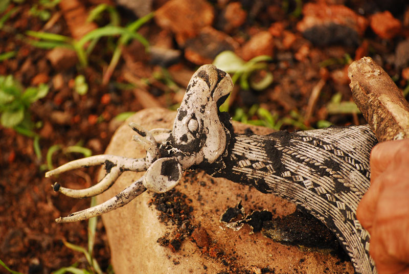 It follows the same process of casting and firing. When the model becomes red hot, it is lifted from the wooden furnace and turned upside down, which makes the liquid metal flow inside the model.