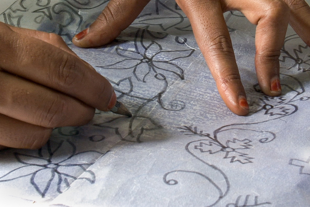 The painting is done on a piece of cloth whose size depends on the design being painted or the type of garment to be made out of it. Initially, the artisan measures a required size of cloth and places a carbon paper on it. This is to trace the indented design to the fabric. Then a sheet carrying various floral designs is kept over the carbon paper and the design is drawn with a pencil. Once the drawing is done, both the sheets are removed and the fabric is attached to an embroidery hoop to start painting. Using a small-sized paintbrush and acrylic fabric colours, the artisan then starts with the periphery of the sketch. Here the colours are transferred to a pallet for easy access to multiple colours at a time. Fabrics paints are a type exclusively manufactured for textiles products. After completing around the periphery, they progress to the interiors of the design to fill in the remaining area. Once the paint dries the fabric can be framed or used to stitch different kinds of garments.