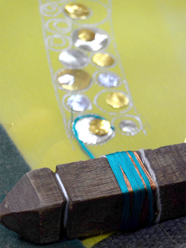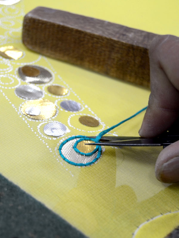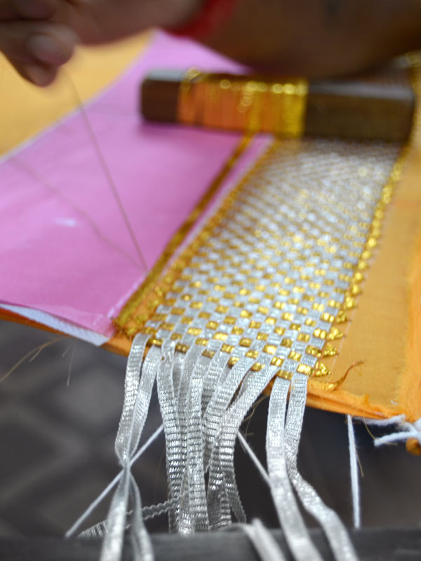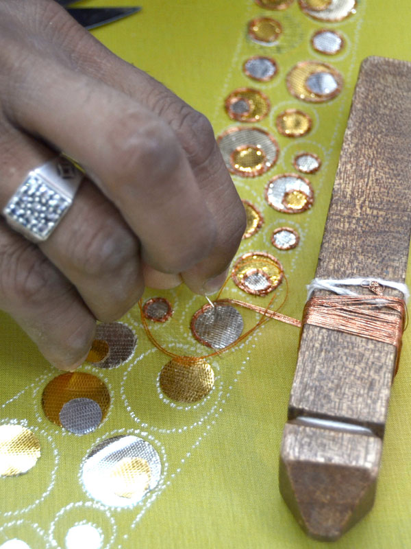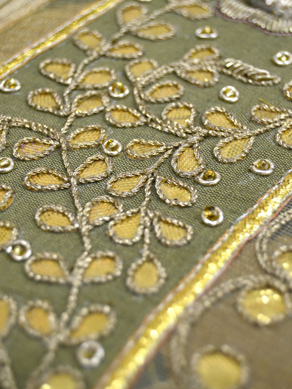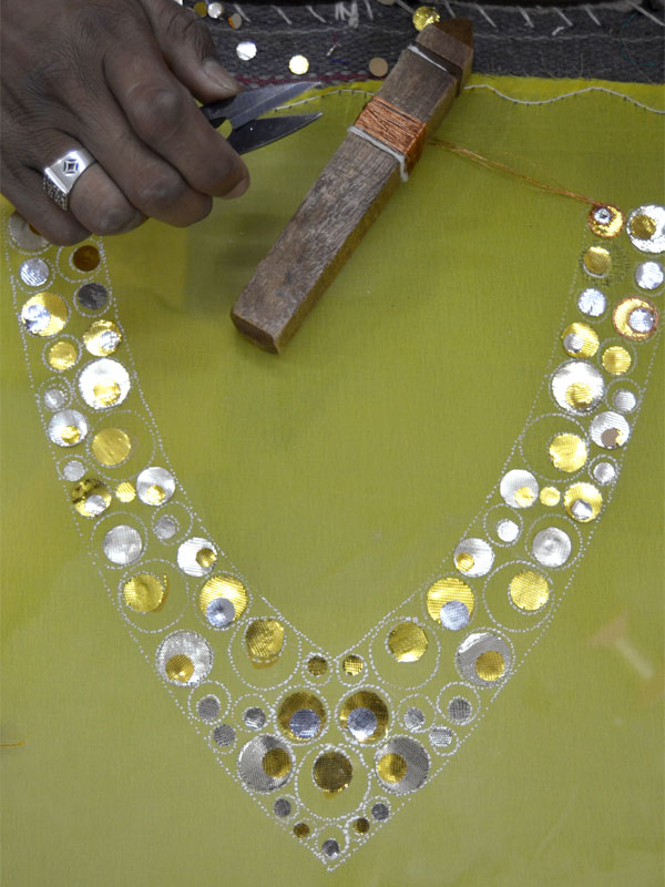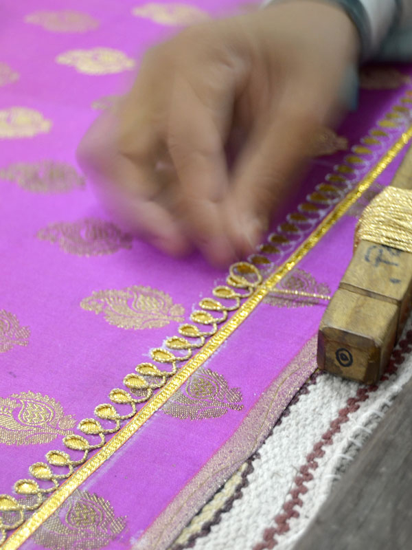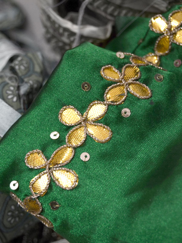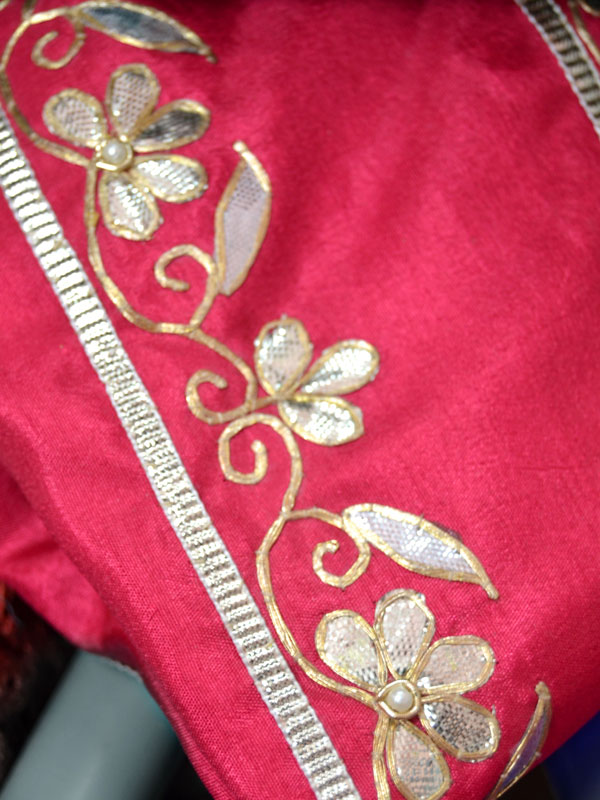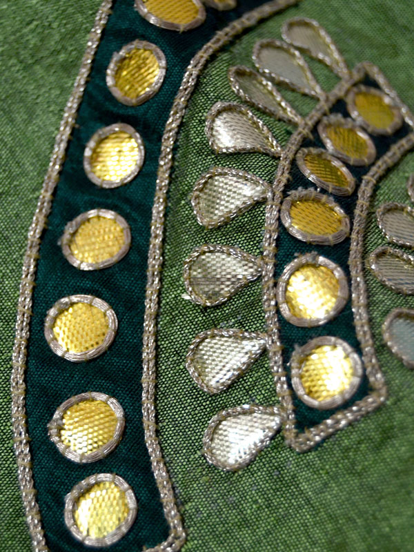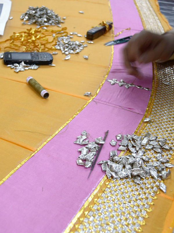 ‘Takaayi’ is the process of stitching Gota on the fabric. Gota is woven on power looms and consists of cotton (warp) and a metal (weft). ‘Gotapatti’ is actually the cutting and folding of these tapes into basic rhomboid units, referred to as patti or leaves, and combining them to create elaborate motifs that include peacocks, paisleys, flowers, geometric patterns and elephants. Pieces of Gota are first stuck with fabric-glue and then appliquéd using running, back, hem or couching stitch. For a simpler effect, Gota strips may also be stitched in a simple line. A wide variety of threads like cotton, silk, metal etc. are used to create outlines of these shapes, adding a dash of color and enhancing their beauty.