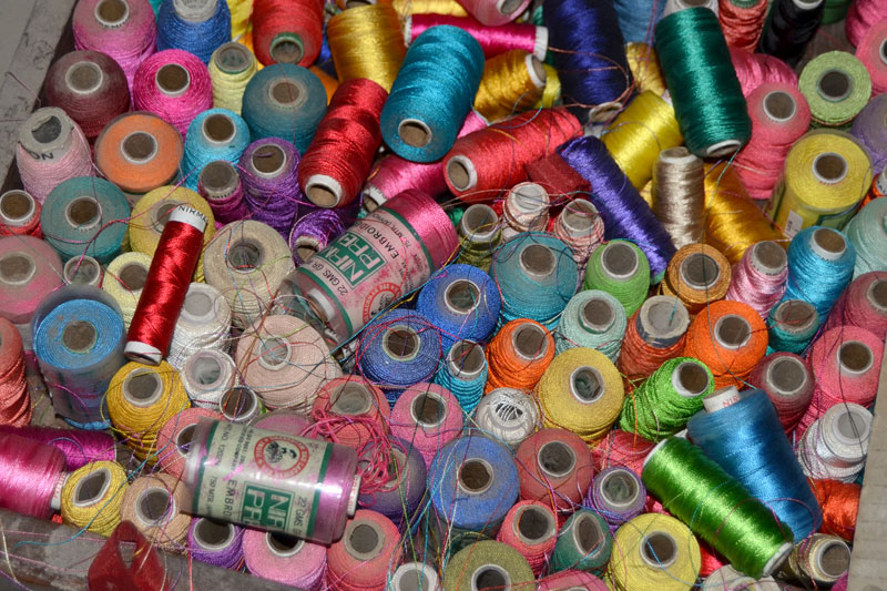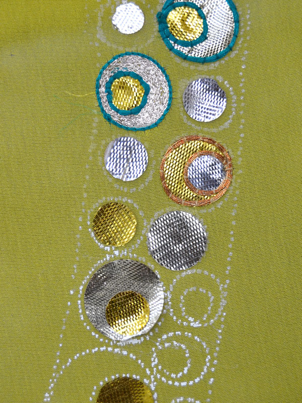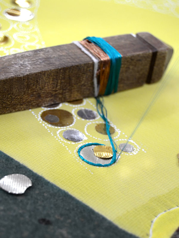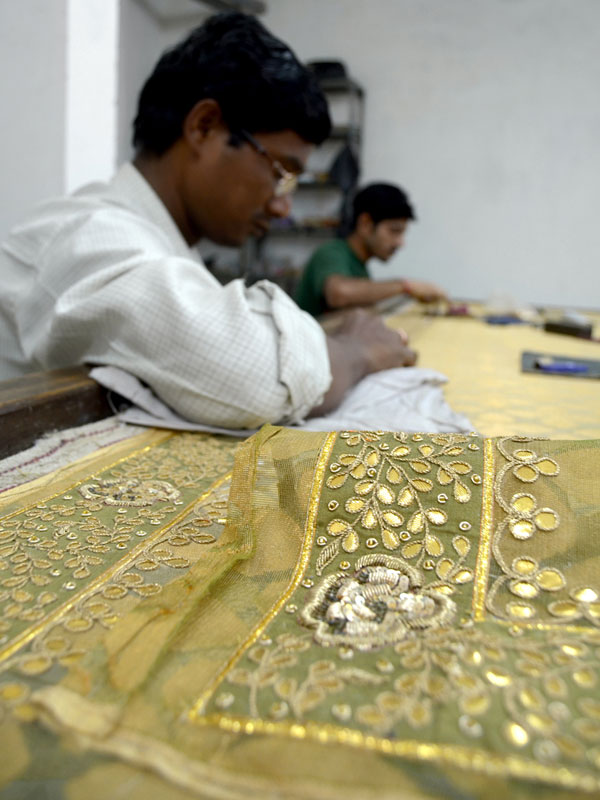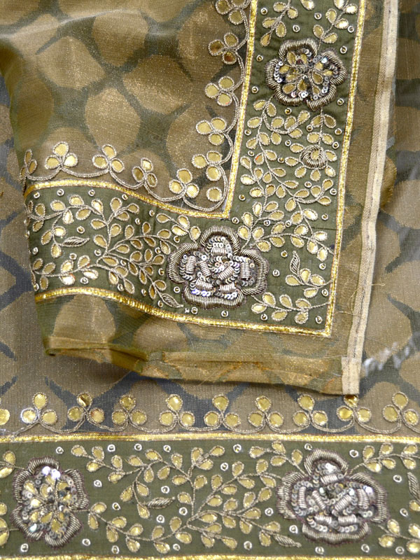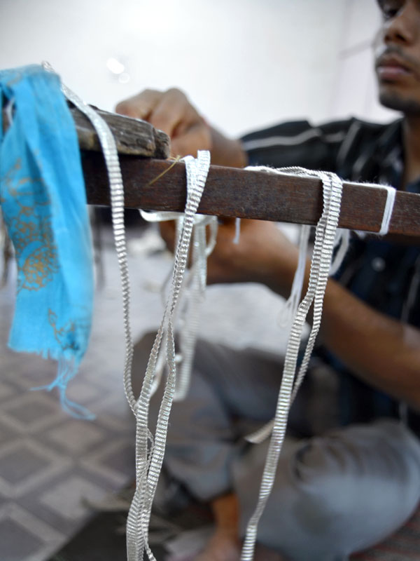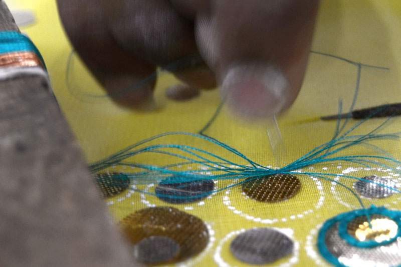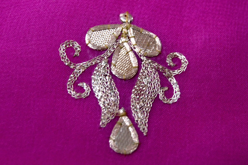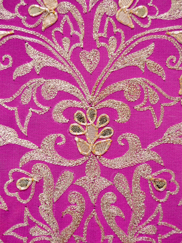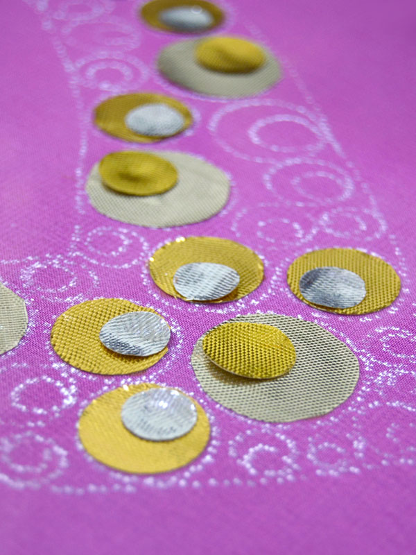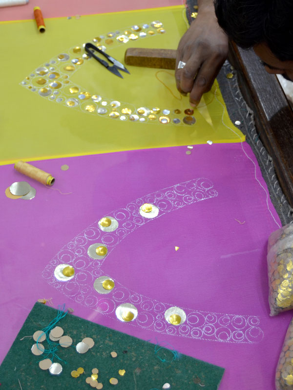 ‘Takaayi’ is the process of stitching Gota on the fabric. Gota is woven on power looms and consists of cotton (warp) and a metal (weft). ‘Gotapatti’ is actually the cutting and folding of these tapes into basic rhomboid units, referred to as patti or leaves, and combining them to create elaborate motifs that include peacocks, paisleys, flowers, geometric patterns and elephants. Pieces of Gota are first stuck with fabric-glue and then appliquéd using running, back, hem or couching stitch. For a simpler effect, Gota strips may also be stitched in a simple line. A wide variety of threads like cotton, silk, metal etc. are used to create outlines of these shapes, adding a dash of color and enhancing their beauty.