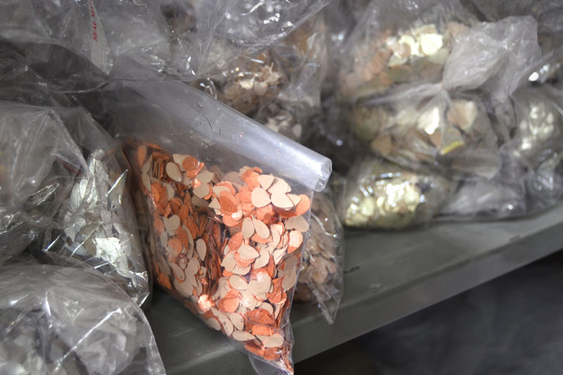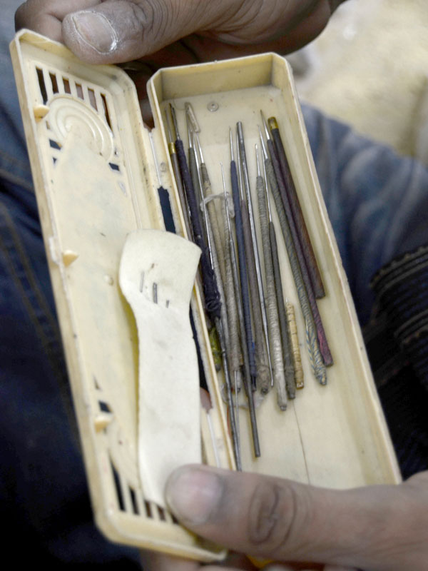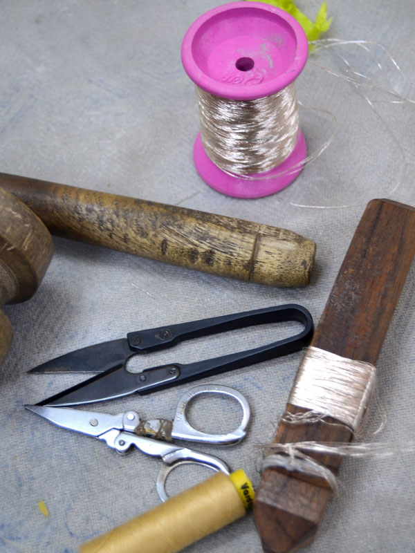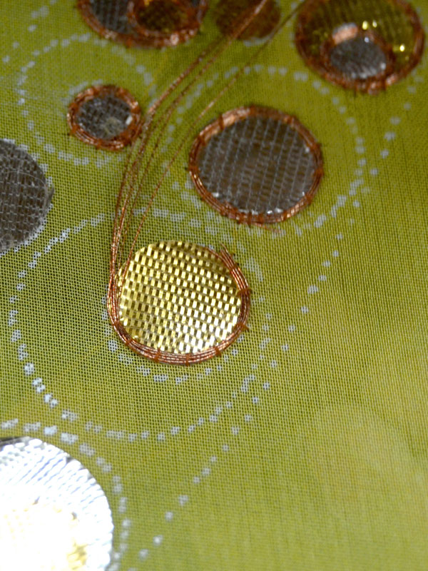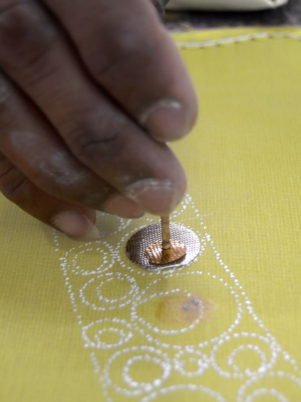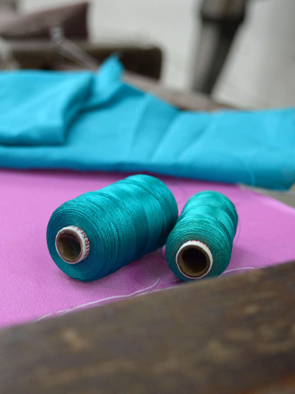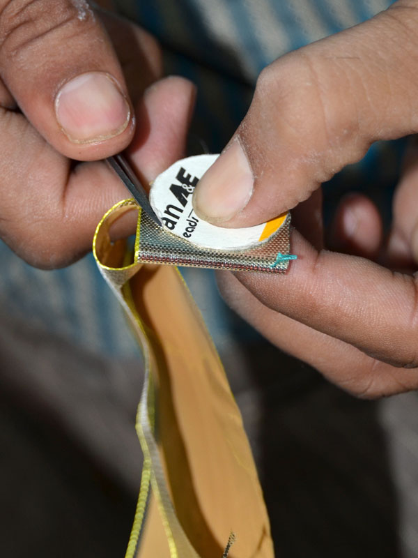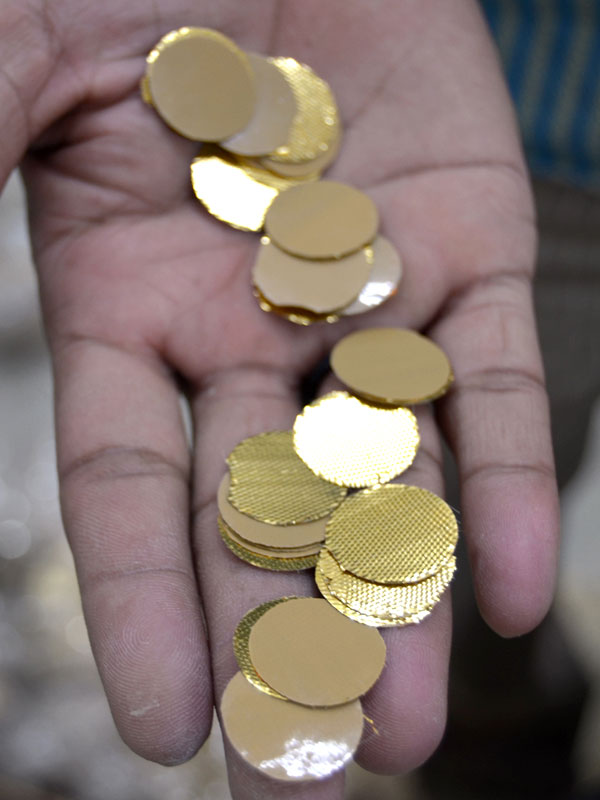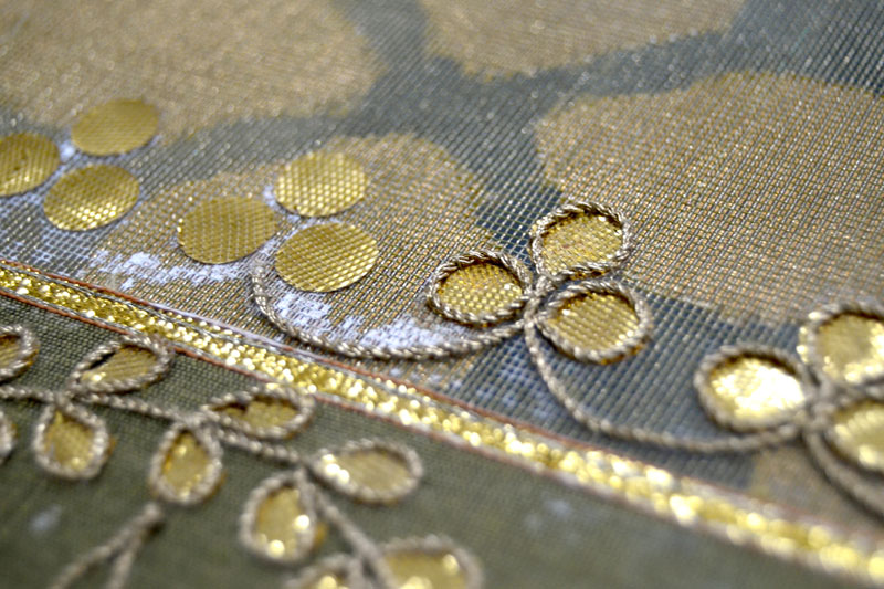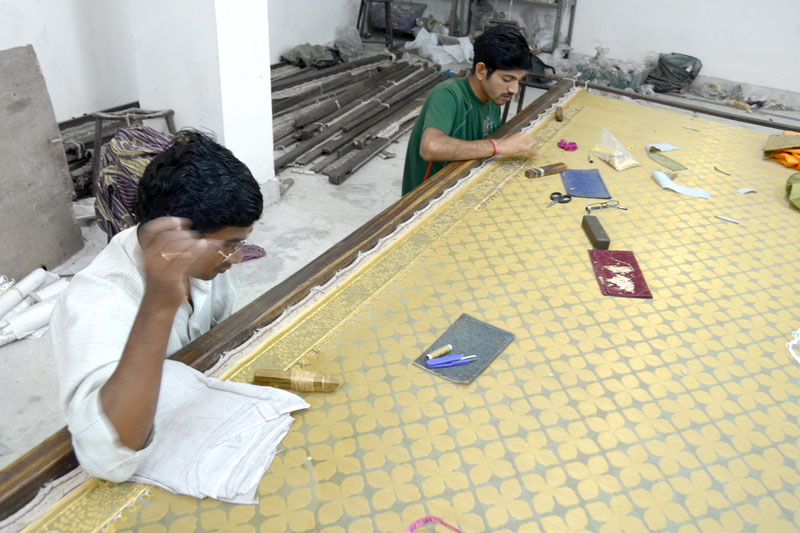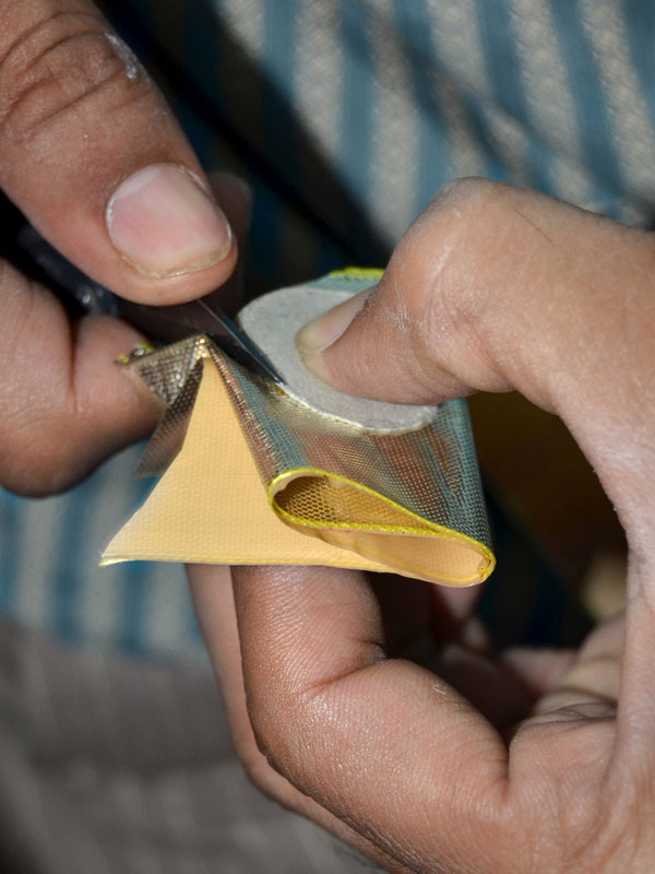 ‘Takaayi’ is the process of stitching Gota on the fabric. Gota is woven on power looms and consists of cotton (warp) and a metal (weft). ‘Gotapatti’ is actually the cutting and folding of these tapes into basic rhomboid units, referred to as patti or leaves, and combining them to create elaborate motifs that include peacocks, paisleys, flowers, geometric patterns and elephants. Pieces of Gota are first stuck with fabric-glue and then appliquéd using running, back, hem or couching stitch. For a simpler effect, Gota strips may also be stitched in a simple line. A wide variety of threads like cotton, silk, metal etc. are used to create outlines of these shapes, adding a dash of color and enhancing their beauty.