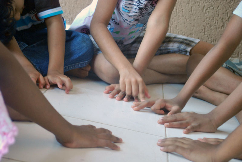 All the players sit in a close circle with their hands on the floor facing down and fingers spread apart. One player becomes the leader and participates by keeping only one hand as against all other players who place both their hands on the ground. Only the leader recites the song of Akkad Bakkad touching fingers of every player one by one. This continues in a clockwise manner touching one finger at a time. The player on whose finger the song ends (with the word bhaaga or be-sha-ram if playing with the extension version) closes his finger and the game continues by repeating the same recitation from the finger immediately next to the one closed. Each finger closed is skipped and not counted while reciting the song. One by one all fingers close and players with all five fingers closed can take their hands away. The player first with all ten fingers closed wins the game. The game continues until all the players get to close each of their fingers.