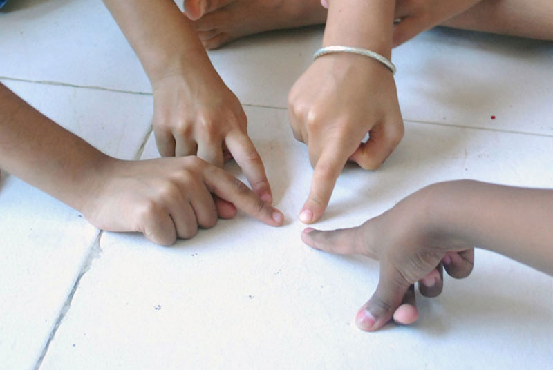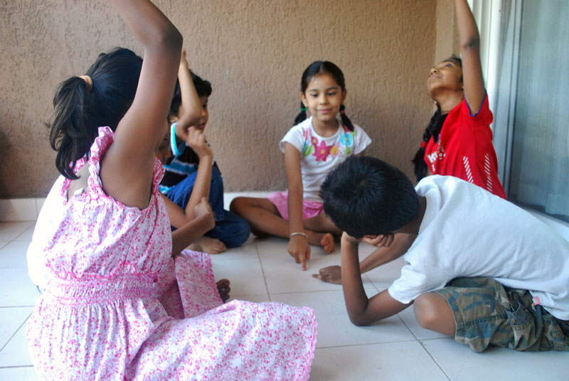 Children sit in a close circle with their index fingers kept at a common point. One child becomes the leader and shouts a name - it can be an object, person, living or non-living followed by the word Udd (fly) like in “Elephant Udd, Parrot Udd, Balloon Udd, etc.” This is combined with a gesture of moving the index finger up in the air and bringing it back to rest. To this all players react by either raising their index finger or choosing not to raise it. The decision is made on the fact whether the name announced can fly in real or not. If it can, then all the players raise their fingers up along with the leader; otherwise, they sit still. Players are out of the game on two conditions either they do not raise their finger for a flying name or they raise their finger for a non-flying name. The game continues with every time the leader shouting a new name randomly until all players are out of the game. Kids take turns to become the leader for subsequent rounds of the games played.