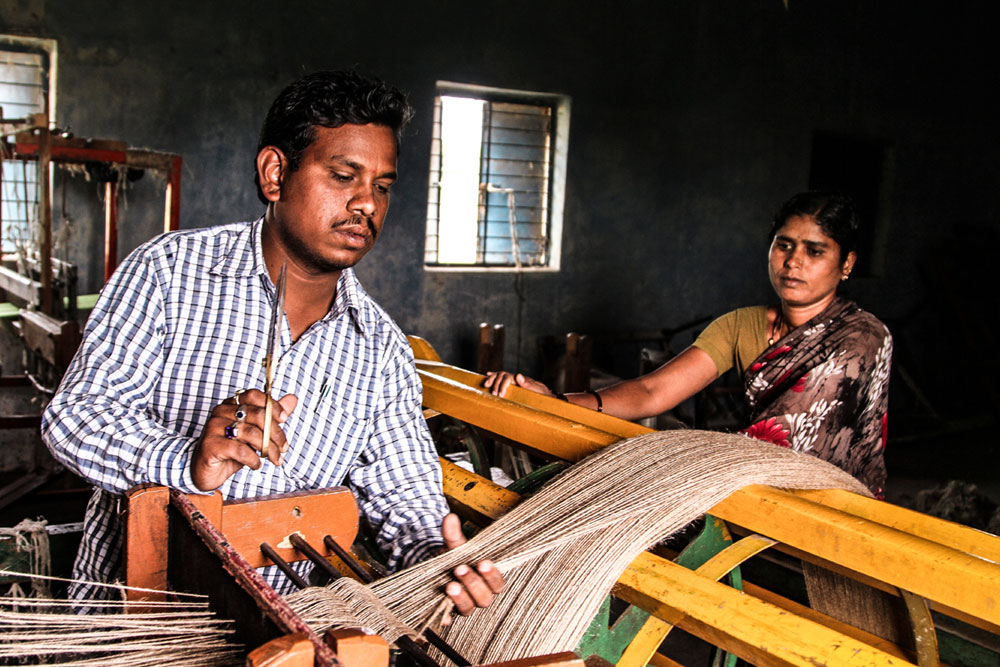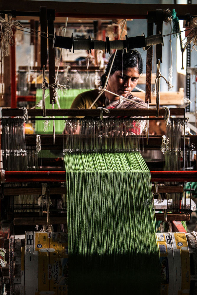 Cotton thread comes in yarn type bundle, which is also fed into charkha to create bobbin with cotton yarn. Numbers of these cotton thread bobbins are placed in a long wooden stands, which makes up a “Creel” which is then rolled onto a warp beam to create a seamless parallel bunch of threads, rolled on a roller (beam lad), it is placed on a handloom machine, and this process collectively is called as “warping”. From there individual thread is drawn into two sets of heddle shaft, later on passing into the reed, which prevents the tangling of threads while weaving. Heddle shaft is connected to a foot-operated pedal which while pedaling lifts up alternate heddle shaft which in turn lifts alternate half of the cotton threads, during this process a gap is created between two heddle shafts and shuttle (which is carrying jute thread) travels to lay out jute thread, which then is locked by “Beater”, the completed part of weaving is collected by cloth roller placed on weaver’s side simultaneously. This process continues at a greater speed to produce continues length of fabric as per required width and length.
