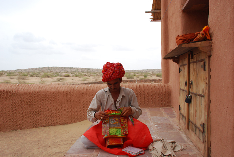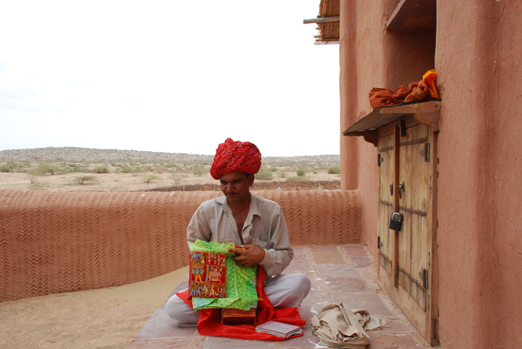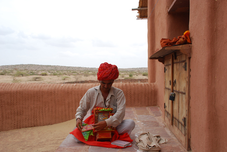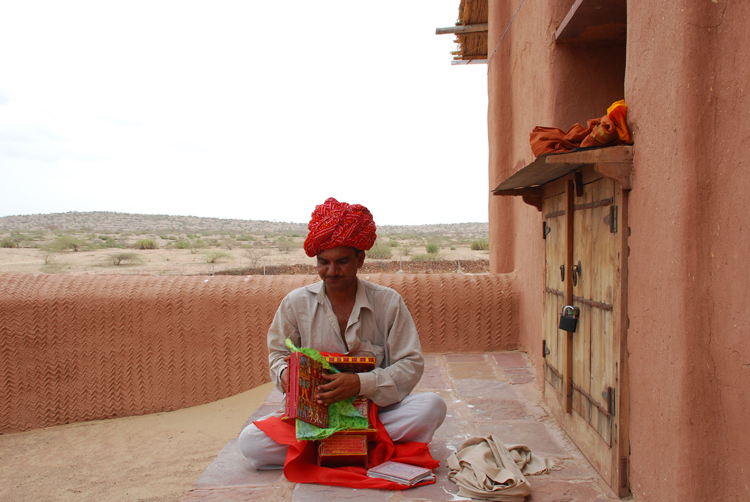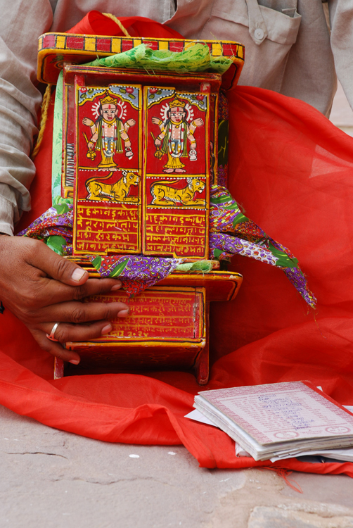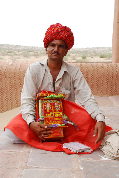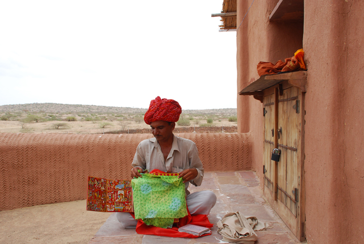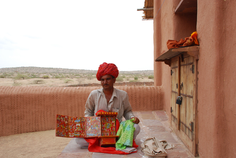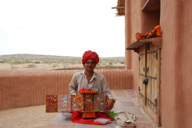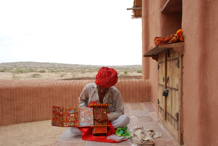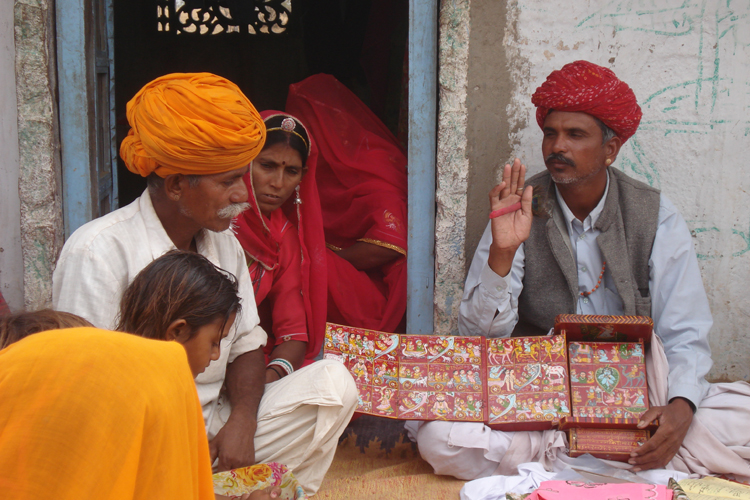 They belong to the Bhat community and are known as Kaavadiya Bhats or Ravs. They live in Marwar, around the Nagaur and Jodhpur districts in Rajasthan. They believe they are the progeny of Shravan Kaavadiya from the Ramayana and came from the brow of Shiva, which is why they say they have such good memories and can tell stories for hours at a stretch. They make annual trips to their patrons and recite stories from the epics and the genealogies from them. In return they receive gifts in the form of grains, livestock and money.