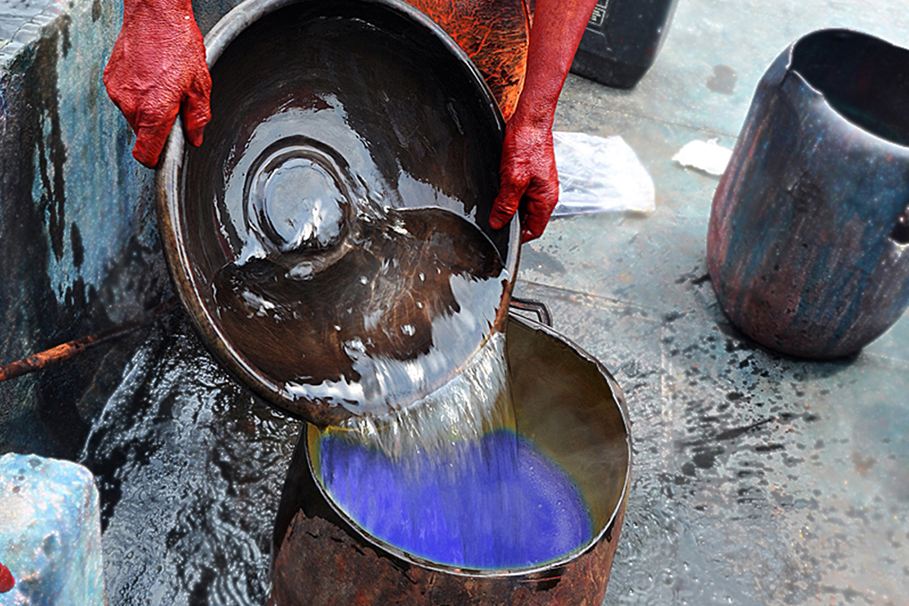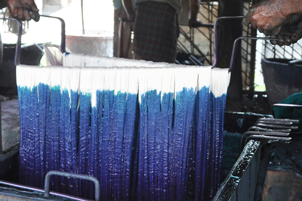 The traditional saree from Chettinad is made of pure cotton. The yarn procured from Coimbatore sent for cleaning process (locally called), where starch is applied to increase the strength followed by coloring process, washed in normal water and dried in room temperature. The colored yarn is wound to the pirn for the weft, where the yarns are dipped into the vessel containing water for the color check, strength and then wound. Simultaneously the yarns are stretched, opened, looped by using stout bamboo rods and dried outside (street) for the warping process. The newly prepared warp is attached to the corresponding thread of the previous saree, where the process of weaving (for next saree) continue by attaching the corresponding threads.