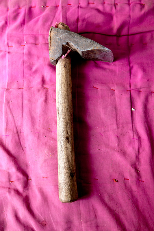 Hammers of different types are used at different stages of the making process. Big head hammers are used while carving the face and small head hammers are used for nailing.