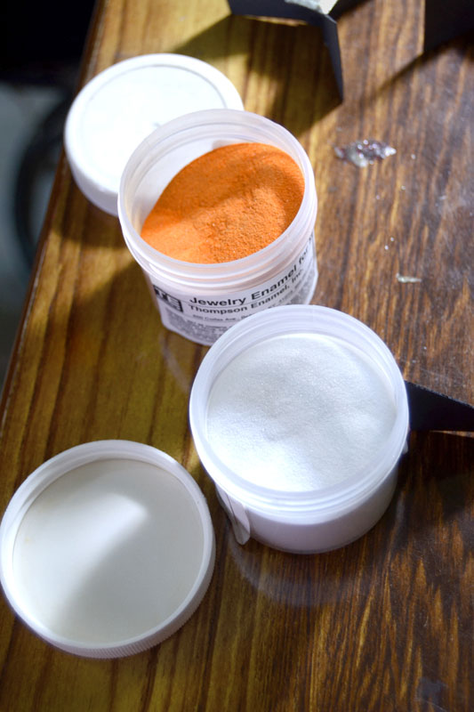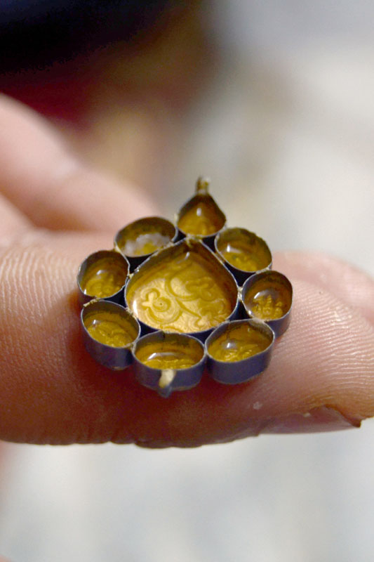 The jewelry piece has to be fired as many times as the number of colors used. Firing could be done in an electric kiln or on the coils of the domestic heater using a thin iron mesh. This fuses the color to the gold. Once all the colors are filled in and fired, the piece is scrubbed with a filer to enhance the gold outline of the pattern. Then this is boiled with a mild acid for sheen and sent to the next karigar for stone-setting.