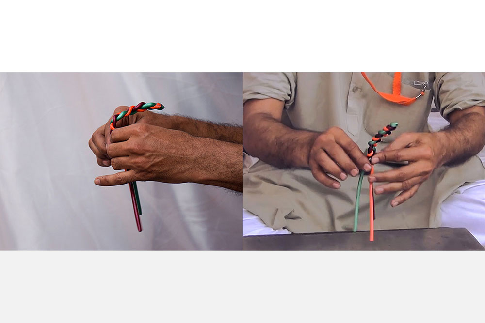 Lac bangles are made by using colourful lac sticks. These lac sticks are made by melting lac shellacs in a vessel, and when it is in a semi-molten state colours are mixed with it. These colourful lac sticks help artisans in making bangles in less time. A coal burner is used to make the lac stick soft. When the lac starts heating and softening, it is pressed against a metal plate (Silla) simultaneously in intervals with a flat wooden tool locally known as Hatta. After getting the required length, the craftsmen cut out the rolled-out lac with the metal sheet. Another colour lac stick is also rolled and cut with the same process. The two colourful coils are inserted through each other to make a design. The ends of both coils are heated, joined with each other, and is firmly pressed. The craftsman inserts the completed lac bangle into the round wooden rod to give it a proper size and shape. Preheated aluminum bangle is inserted into the lac bangle. A flat wooden tool is used to push the aluminum bangle inside the lac bangle. Once again, the round wooden rod is used to mend the bangle in a circular shape. Then the bangle is heated to hold the aluminum bangle tightly inside the lack bangle. The bangles are finished with embellishments with stones or beads, and a few are kept simple with vibrant colour combinations.
