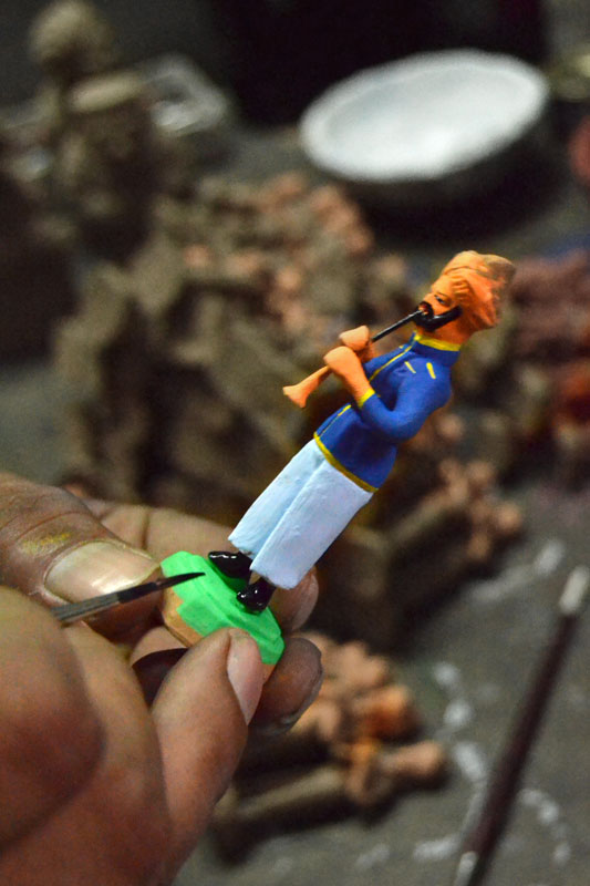 After baking, all the toy and figures are painted a skin color. The eyes are painted first, after which the stand for the figures is completed. The lips are colored red and the hair black. The costume with complete details are painted last. The brushes and paints used are the ones commonly available in the market. The colors are however mixed with dhoo ki gond, a locally made glue, before being used.