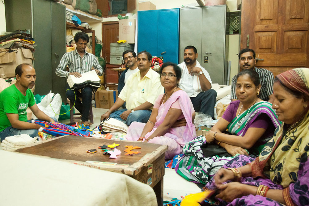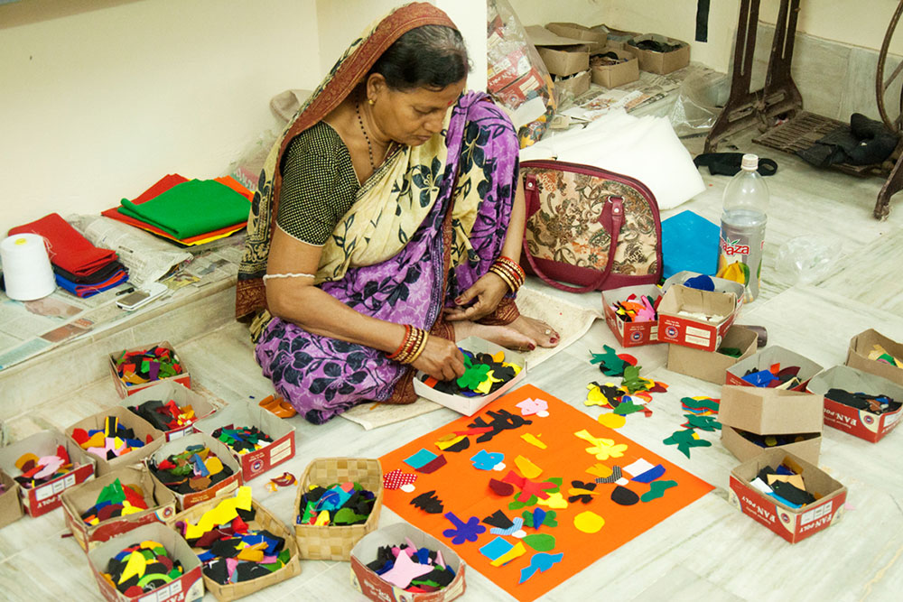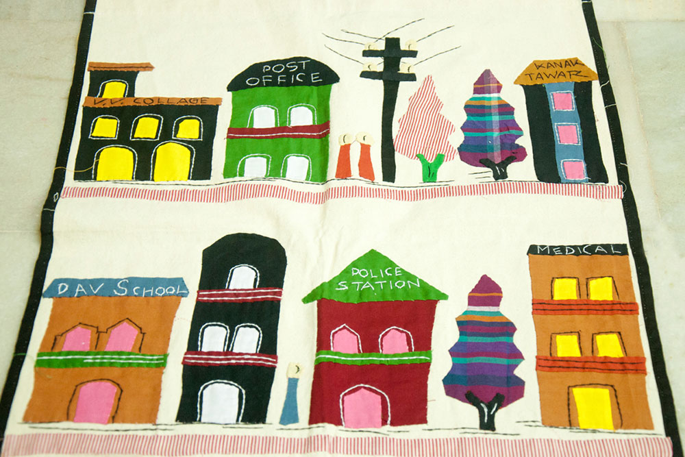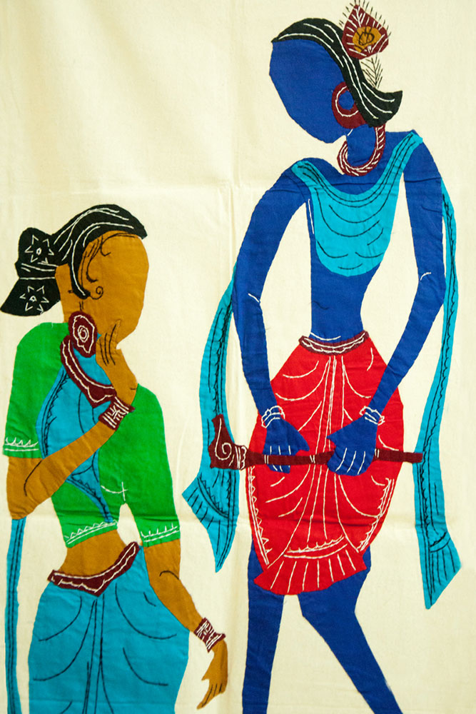 Modern applique art is a unique technique by which the enhancing effect is gained by superposing pieces of coloured fabric on basic fabric in predetermined layout and sequence, the patch edges are sewed. The applique work is normally done by hand. In olden days applique work was confined to the Darji (tailor caste). Initially the designs are traced on the cloth and then patterns are sewed. Finally embroidering will do the detailing. In applique work there are two different categories such as Traditional Pipli applique work and Modern applique work. Modern applique work is nothing but traditional patchwork mainly based on daily life and religious festivals with less embroidery work where as traditional applique work is based on the traditional aspects and decorated with traditional embroidery designs using mirrors.