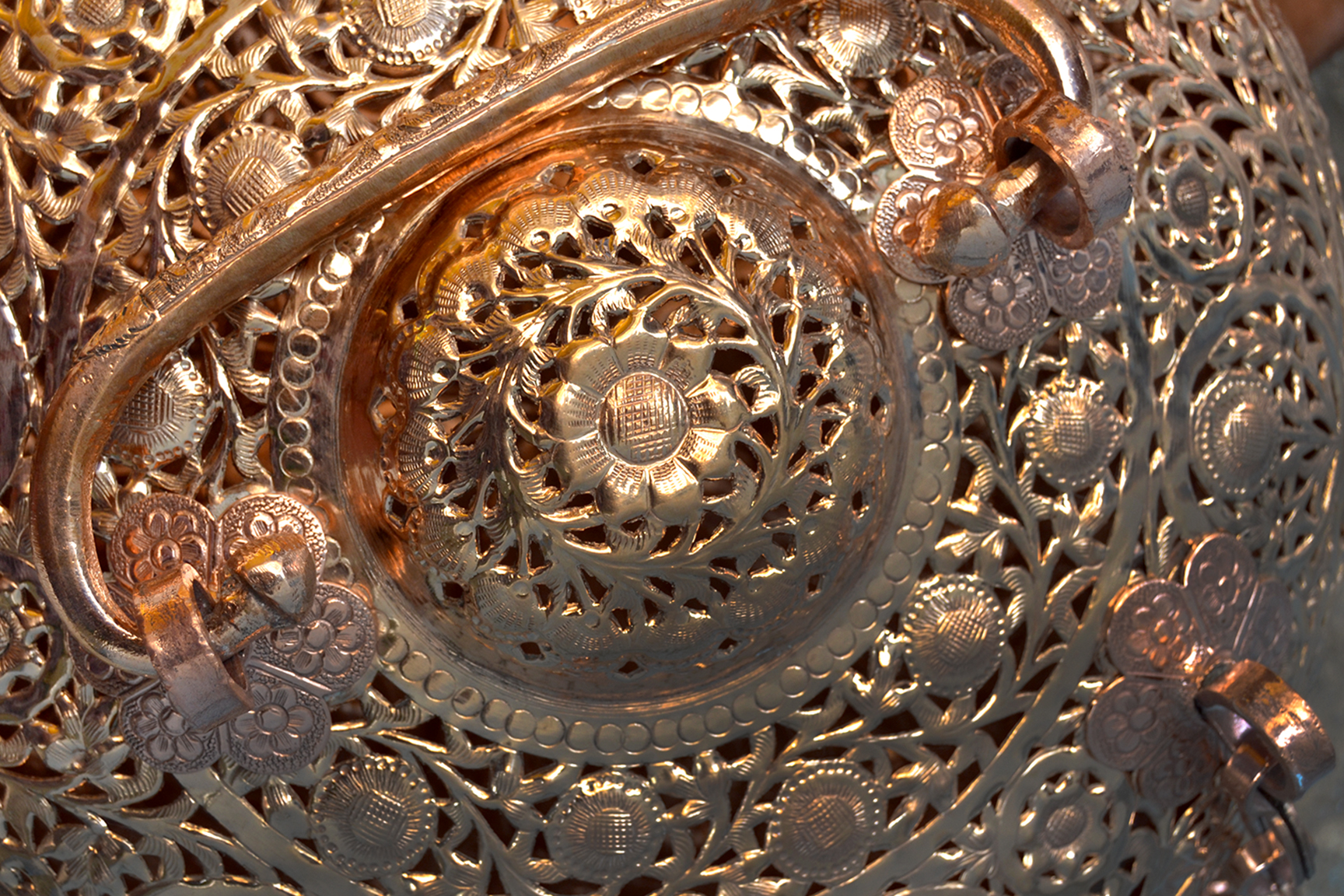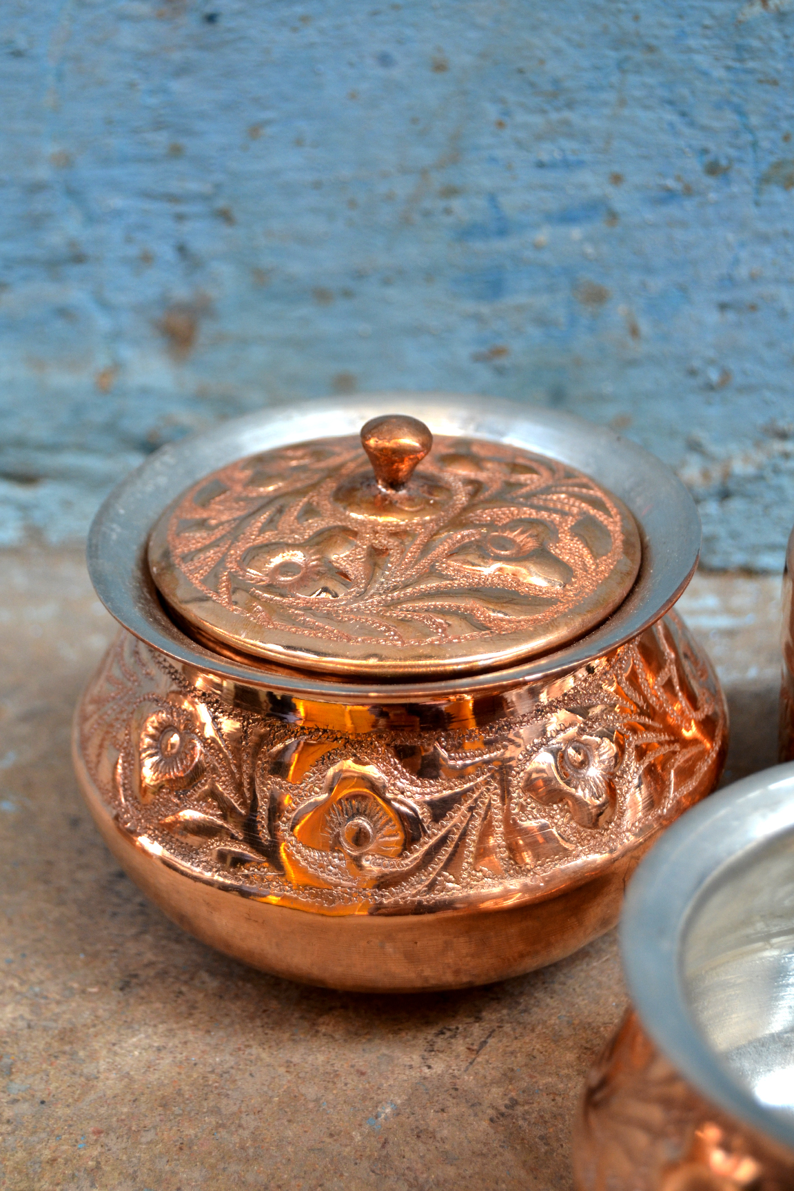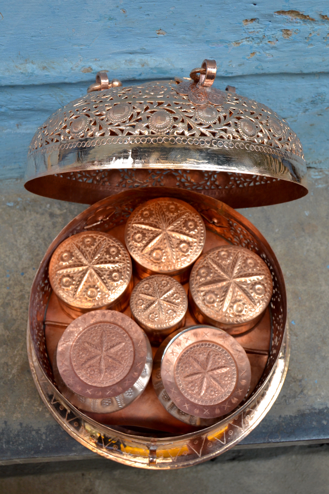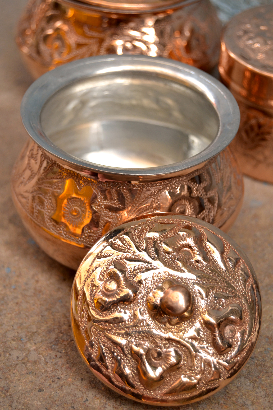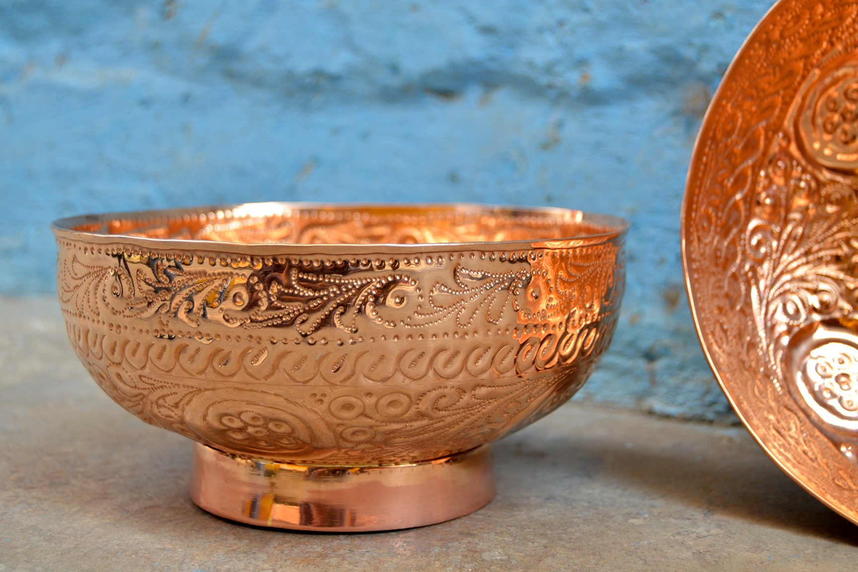 Care: As it is a natural quality of copper to oxidize over time, it is advised that these intricate items be cleaned with vinegar and salt using a non-scratch cloth to reduce oxidization.