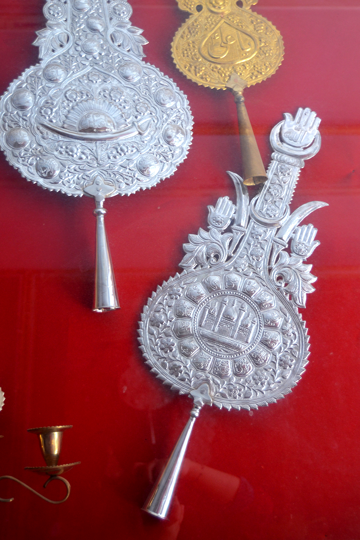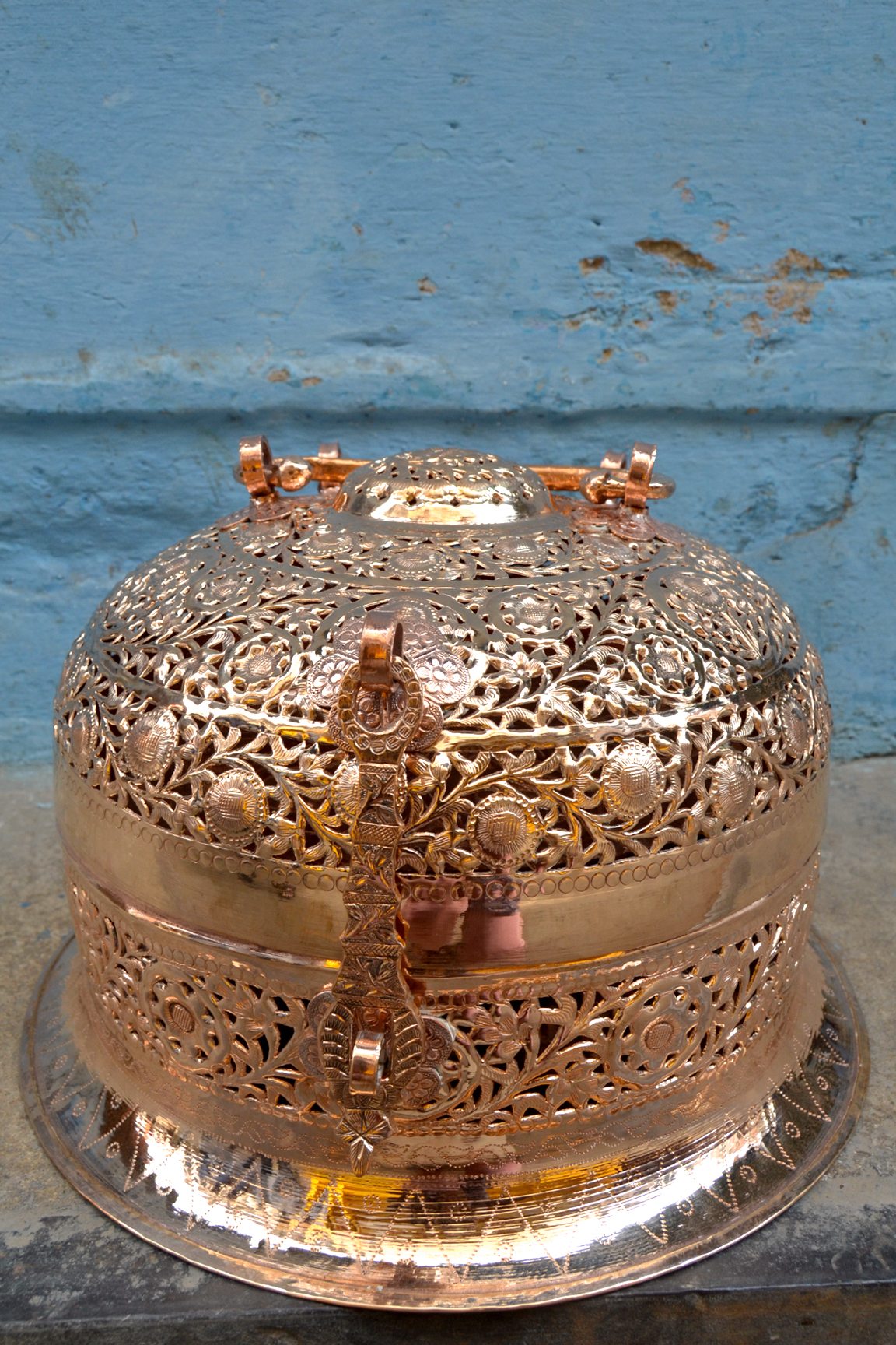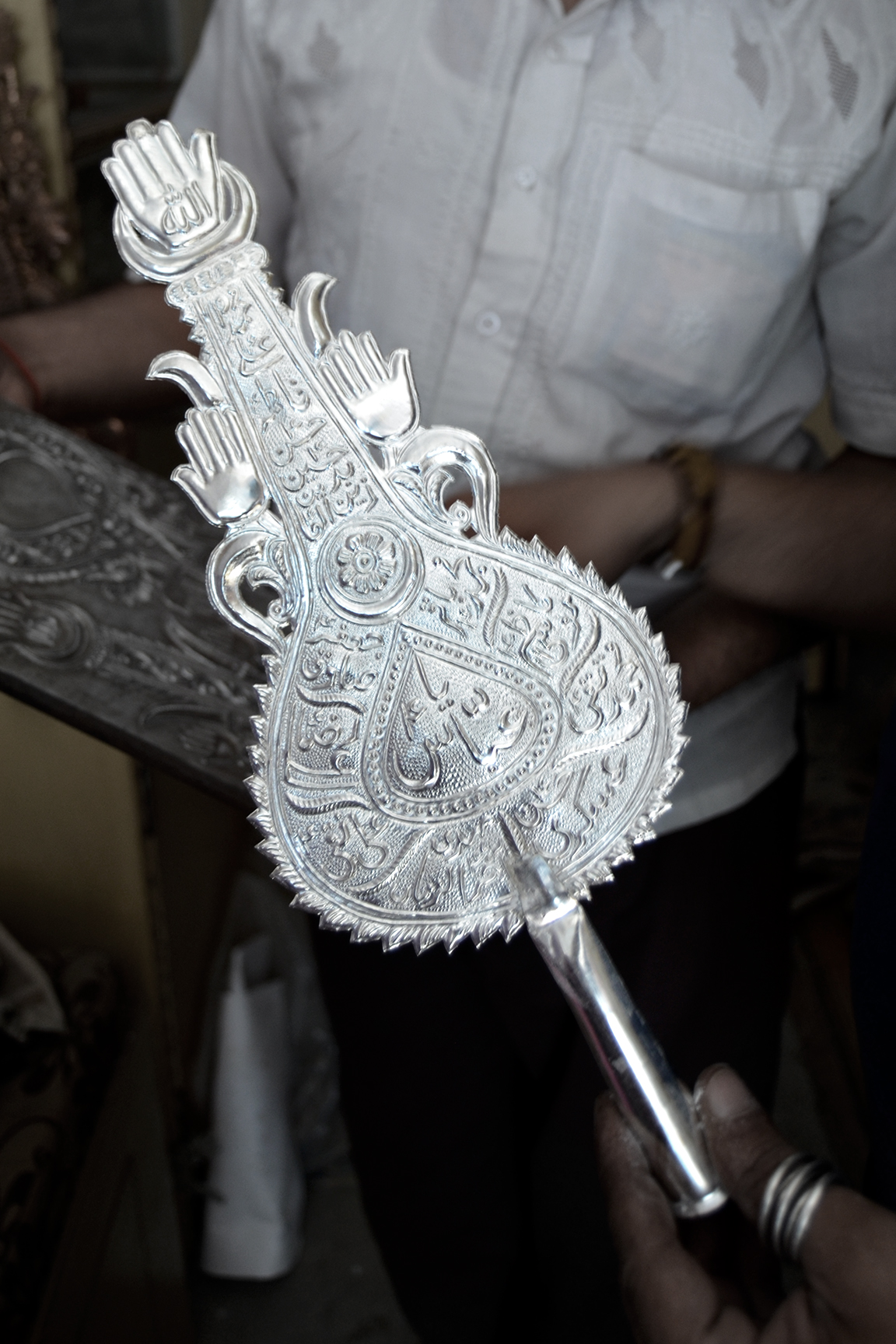 The traditional popular products of this craft are Paandaan (containing boxes of various items used to prepare a paan), Khaasdaan (the pots in which the prepared paans are kept and served), Ughaldaan (used as spittoons which are necessary after chewing pan), Wazoo ka lota, (water pot used for washing hands before Namaaz), Lagan (paraat), Sini (metal plate for covering), Kabgir-chammach (cooking utensils), Deg (cooking pot) and jugs. Alams are also a significant product of this craft. Raju is an Alam specialist and his products are sent to Bombay, from where they are exported to all parts of the world. These Alams are decorated in Muslim homes and mosques. Bought by Shia muslims, these are passed on from one generation to another - like a legacy!