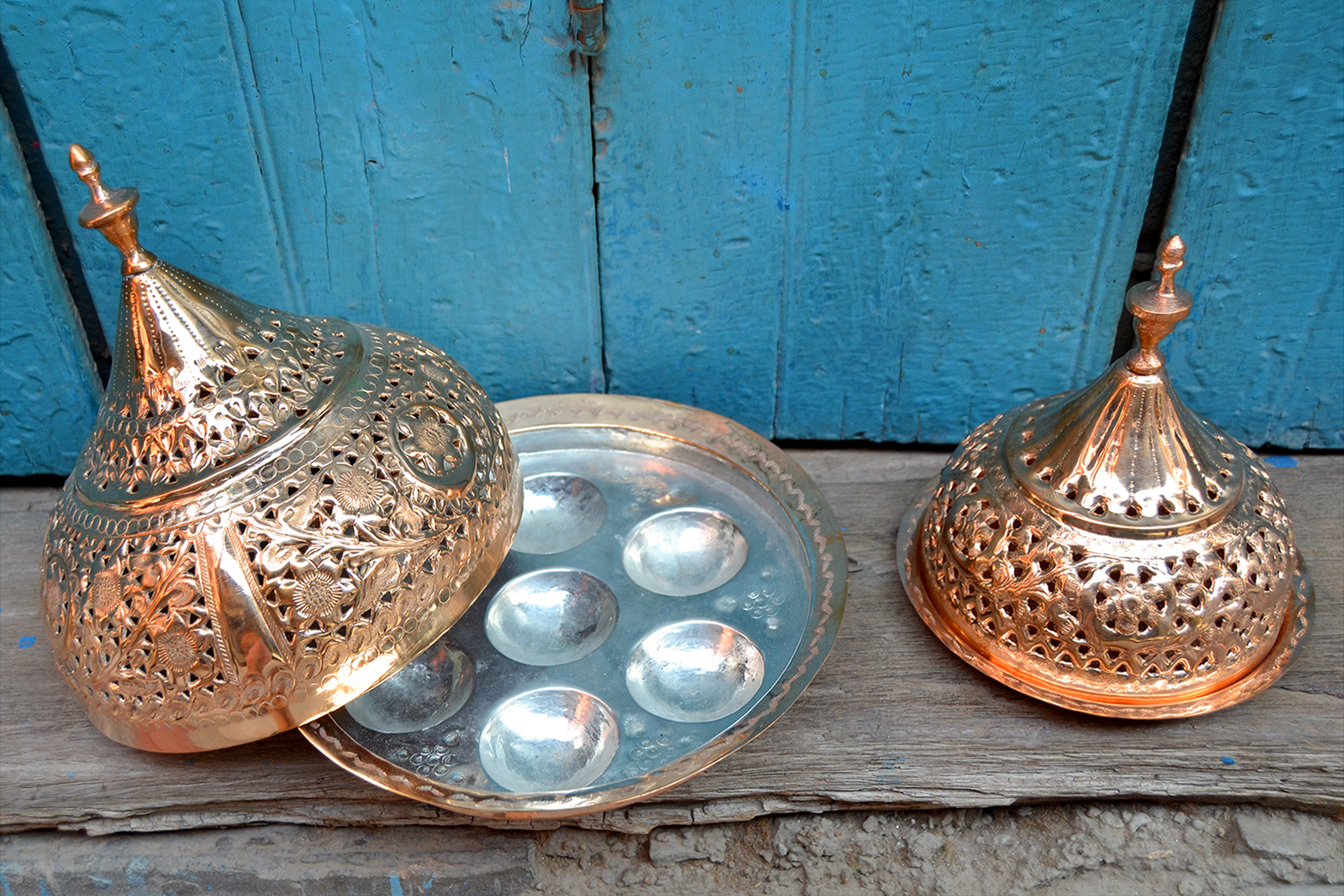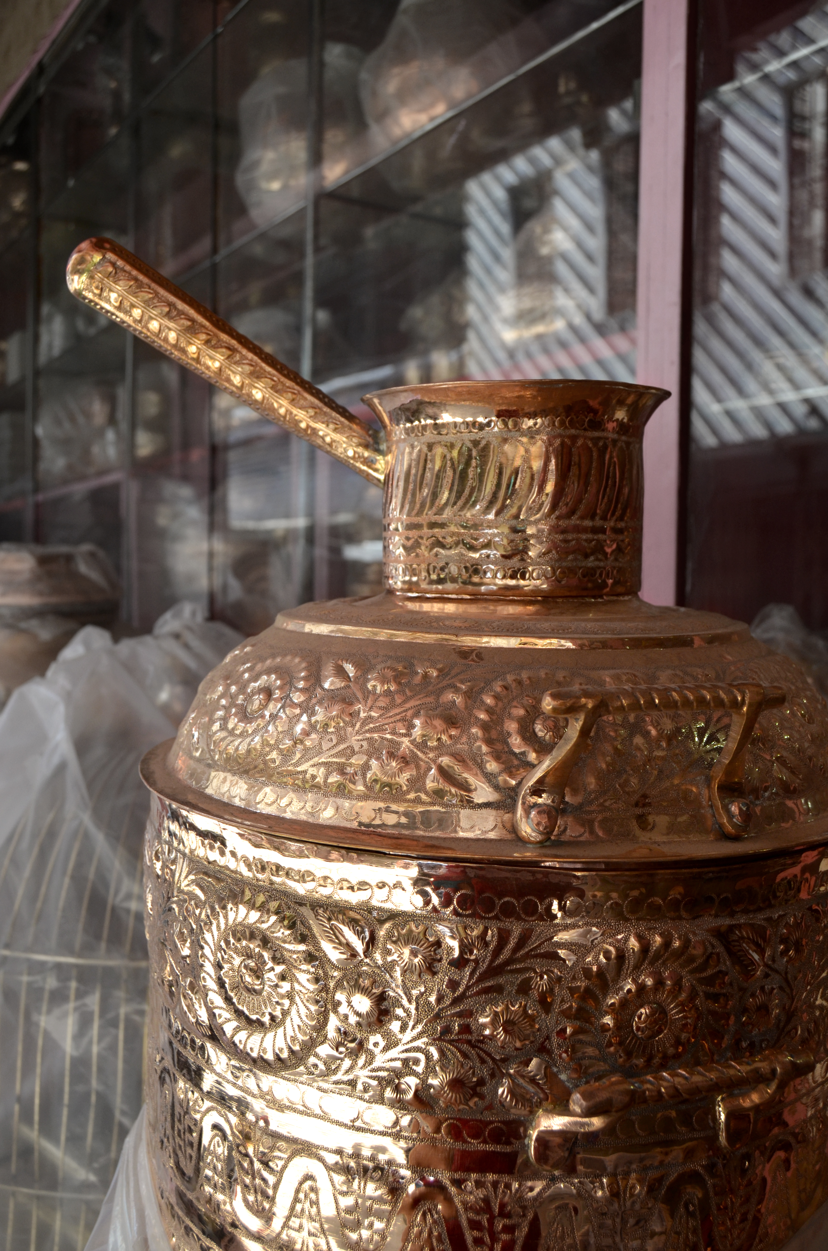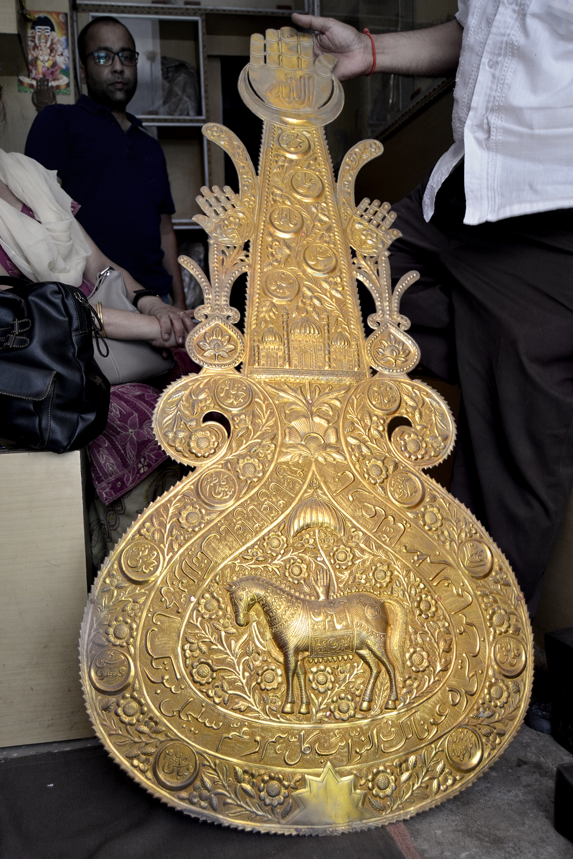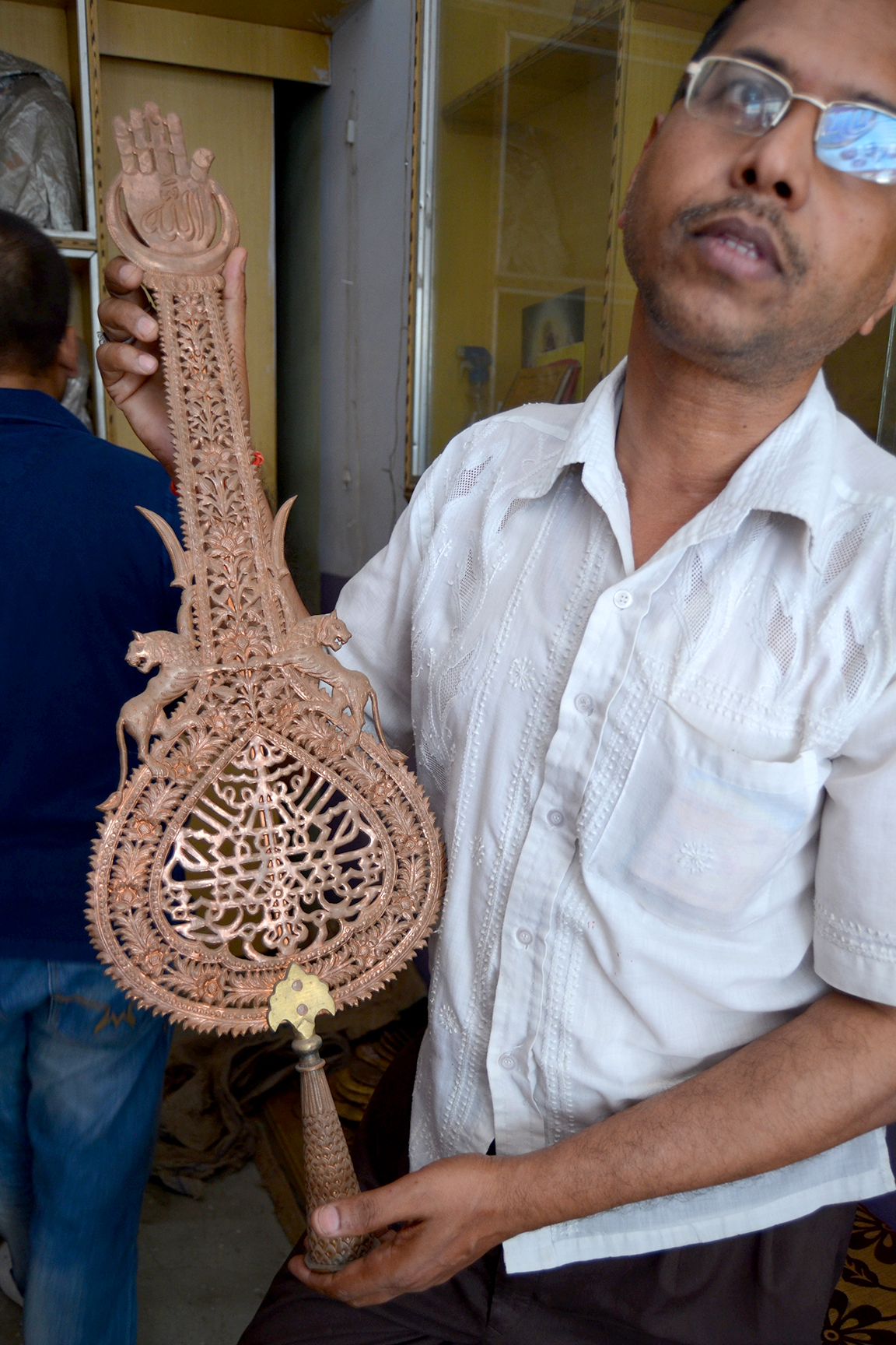 The traditional popular products of this craft are Paandaan (containing boxes of various items used to prepare a paan), Khaasdaan (the pots in which the prepared paans are kept and served), Ughaldaan (used as spittoons which are necessary after chewing pan), Wazoo ka lota, (water pot used for washing hands before Namaaz), Lagan (paraat), Sini (metal plate for covering), Kabgir-chammach (cooking utensils), Deg (cooking pot) and jugs. Alams are also a significant product of this craft. Raju is an Alam specialist and his products are sent to Bombay, from where they are exported to all parts of the world. These Alams are decorated in Muslim homes and mosques. Bought by Shia muslims, these are passed on from one generation to another - like a legacy!