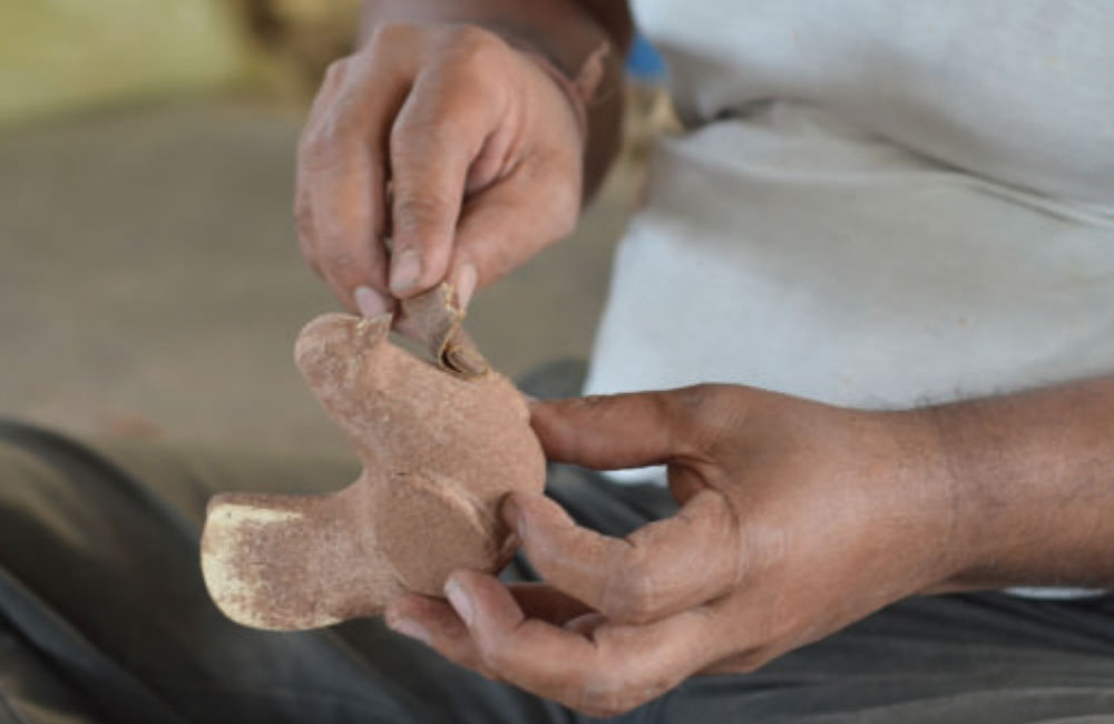 The Nirmal toys are made up of locally available “Ponki Chekka” which is very light and flexible and can be cut into desired shapes and sizes depending upon the toy to be made. Then various parts of the toy are glued together by specially prepared glue and coated with “Chinta Lappam”, which is prepared from sawdust and boiled tamarind seeds and coated with white clay, which smoothens any ridges and depressions if any in the toys. The toys are then dried and finally coloured with brilliant colours. Mostly indigenously prepared hues are used for colouring the toys. Very rare and occasional use of synthetic colours is done.