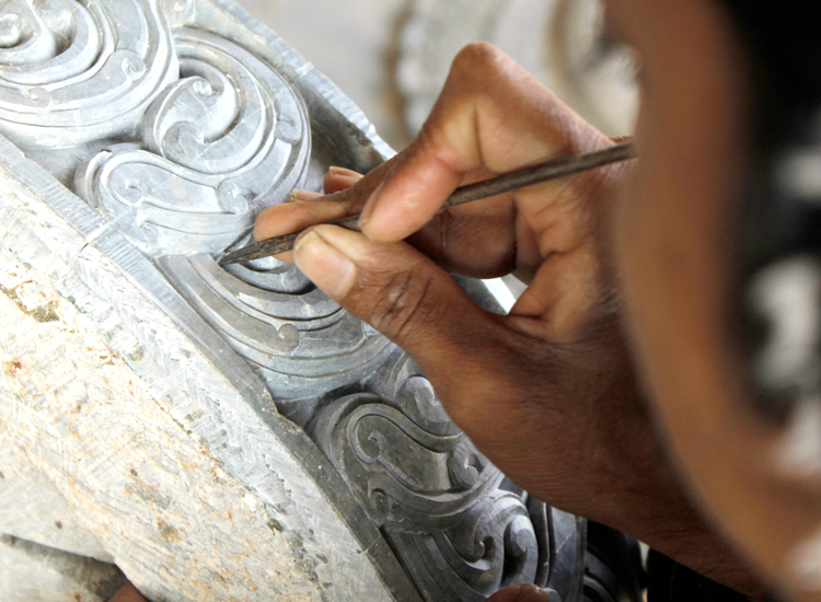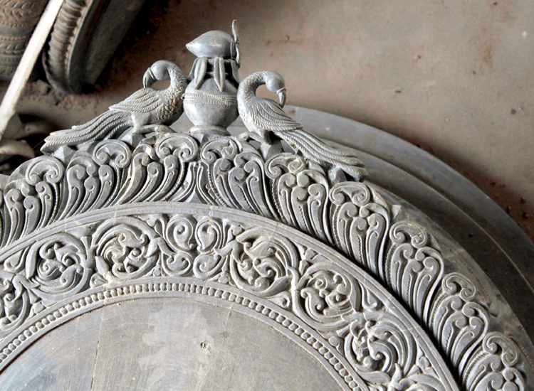 The motifs used are exquisitely embellished like the indolent damsels ‘AlasaKanyas’ and ‘Salabhanjiska’ lady with the bough of a sal tree and the heavenly beauties adorn the topmost tier of the Konark Temple, Konark wheel, Konark horse, elephant, lion composite mythical figures like ‘Gajabidala’, ‘Gajasimha’are quite popular. Other motifs include representation of deities such as Krishna and Radha, Laxmi, Vishnu. Durga, Ganesha, and Hara Parvati. These carvers also make images for installations in temples as presiding deities and Parswa-Devatas as well as large pieces for decoration of public places. One may find samples of these in museums. The four colossal Buddha images and the friezes depicting the life of the Buddha and Ashoka in the modern ‘Shanti Stupa’ at Dhauli are also the handiwork of Orissa’s craftsmen.