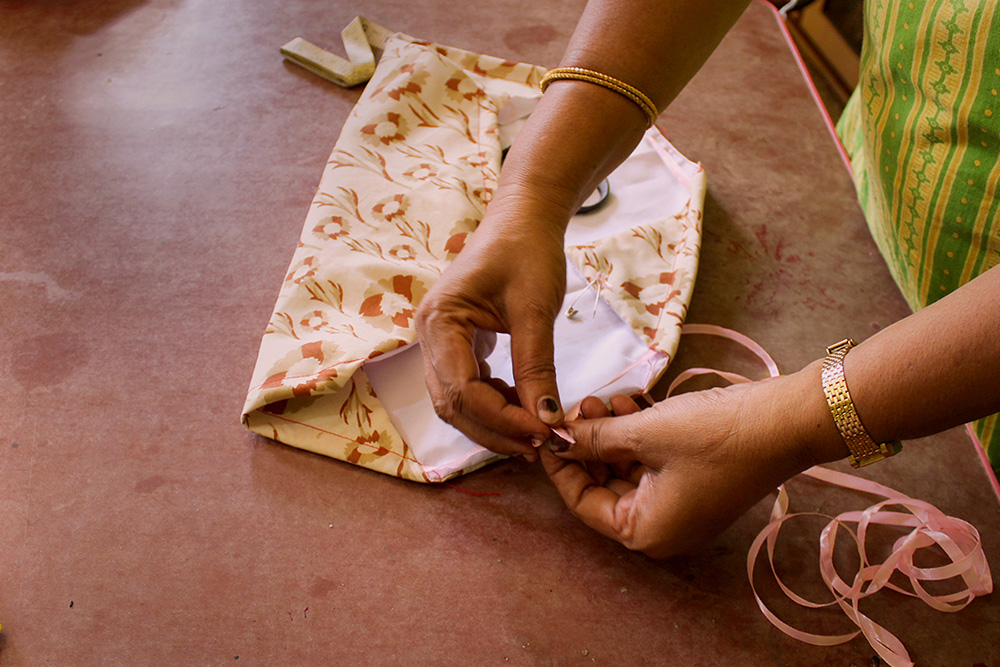 All four corners are folded evenly as per the measurement and are being marked. The thread is being inserted as per the colour combination on the machine. A variety of colour combinations are used for an attractive look. A small gap is left while stitching the four corners for inserting satin ribbon. A safety pin is being pinned at the corner of the satin ribbon to insert it inside the gap easily. A long satin ribbon is inserted inside the four corners of stitched cloth. At one end the satin ribbon is cut and knotted by the artisan. One more satin ribbon is inserted and knotted in the same way. The cloth is turned inside to outside after the corners are being stitched. As the completion of this process, the satin ribbon is pulled up tightly. This gives a complete shape of a potli bag, which is ready to carry gifts.
