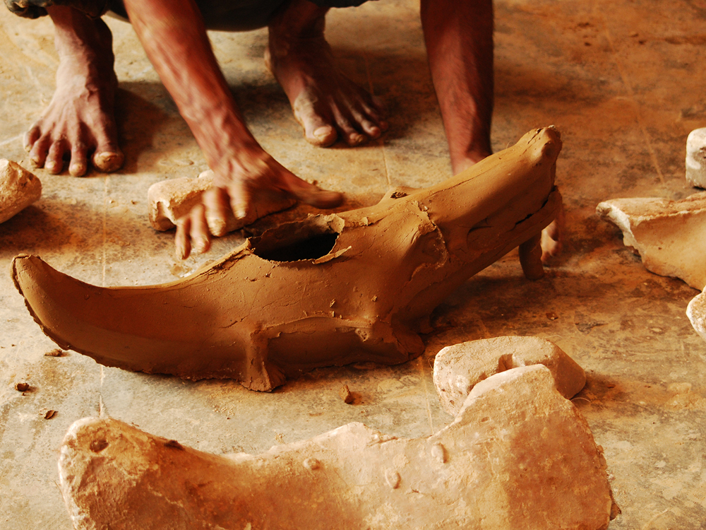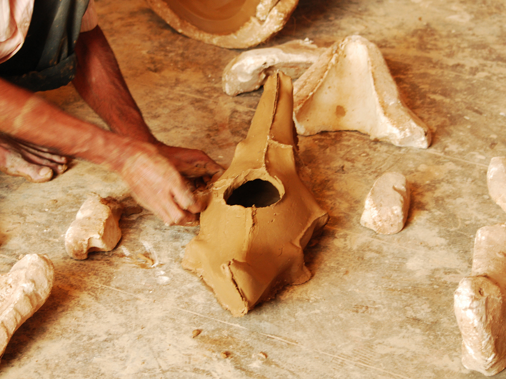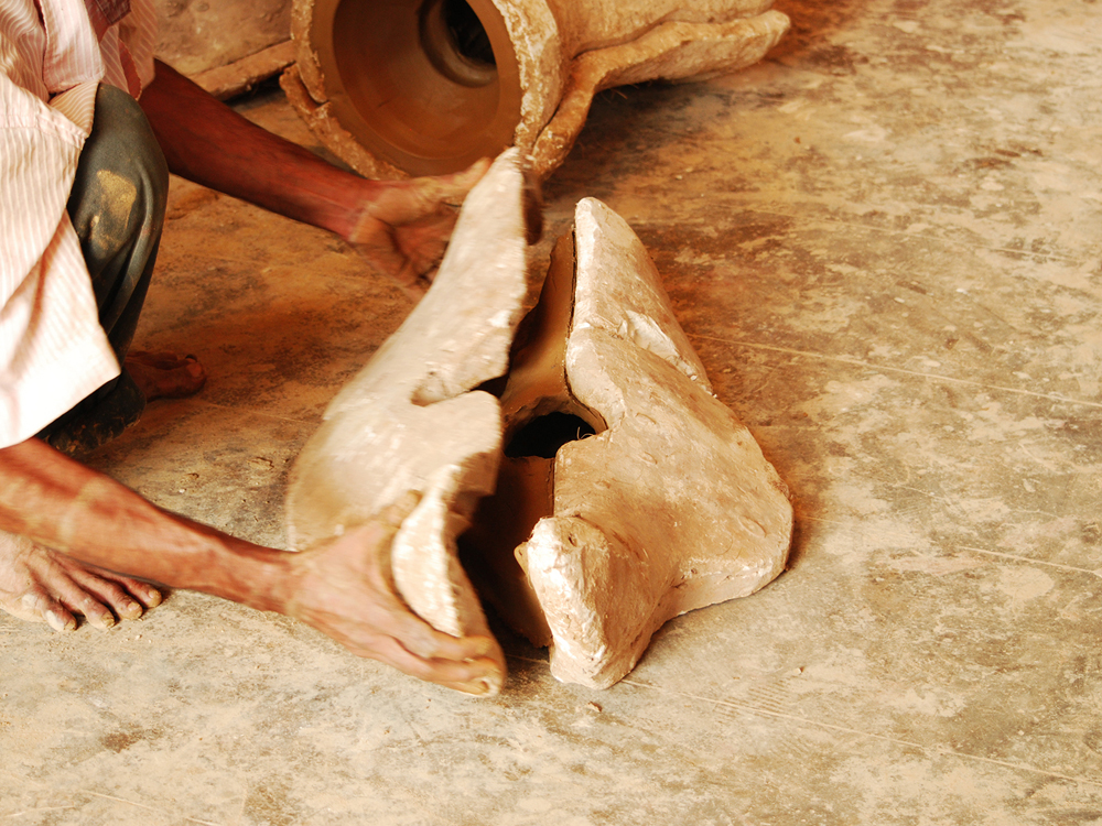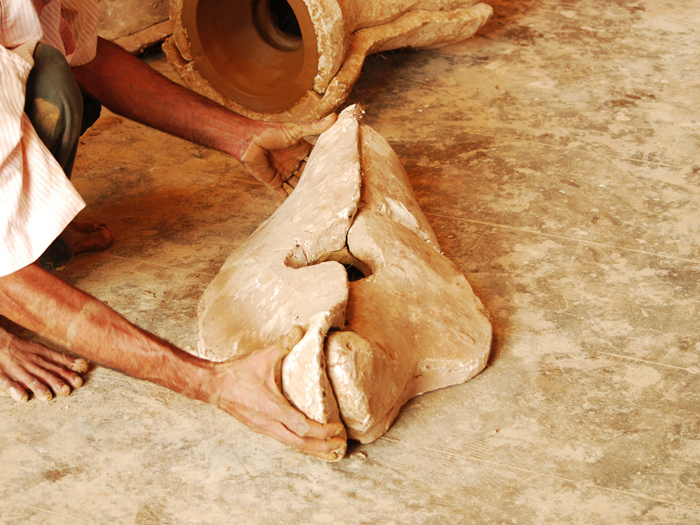 After 24 hours, the mould is dismantled slowly part by part. The clay inside is still soft and workable, but hard enough to retain the shape of the form. The clay has to be soft & workable so that finishing and detailing can be carried out easily.