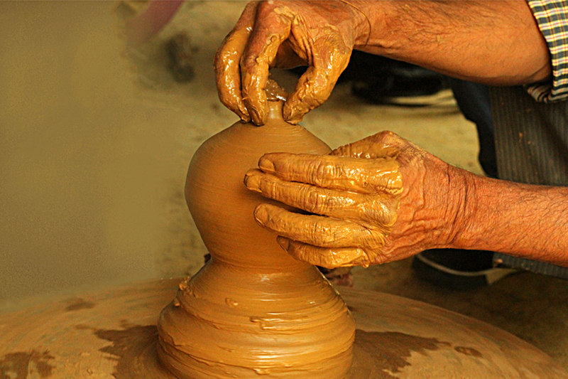 Clay dough is placed at the center of the turning wheel and water is sprinkled to make the clay wet. As the wheel is turned, craftsmen starts to shape the clay. Potter’s wheel is rotated manually or by electric drive. Water is added frequently to retain the moisture. The clay is shaped into desired form. A smooth surfaced stone is used to slide along the shaped article to smoothen and level the article’s surface while turning and finished piece is cut and separated from the wheel with the help of a thread. The shaped articles are dried in direct sunlight. Cooking pots, water storing pots are the basic products made from clay.