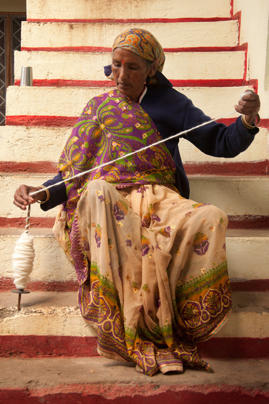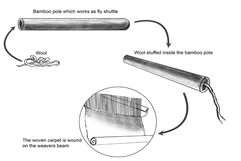 The artisan spins the processed wool in to thread using the traditional method of hand spinning. This hand spin threads is used in fly/throw shuttle while weaving. Threads which are attached to the loom to weave the blanket is spun in charkha machine. The threads are attached to the weaving loom to weave them into Blanket. A wooden log is fixed to the ground to which the warp is tied. This warp is attached to the weaving loom through the four reed .The weaver uses 4 pedaled pit looms to weave the blanket. While weaving a bamboo stick is fixed on woven blanket to maintain the stiffness of the blanket. Woolen thread is arranged on a bamboo stick, which is inserted in the fly/throw shuttle and used while weaving. The wool is weaved into long strips of blanket. Once the weaving is complete the blanket is washed to remove the extra fiber and dried in the sun. Blanket is brushed with a pointed teeth brush on the upper surface, to bring out the hairy texture. This method of washing and brushing is continued until the soft bushiness of the wool is felt.