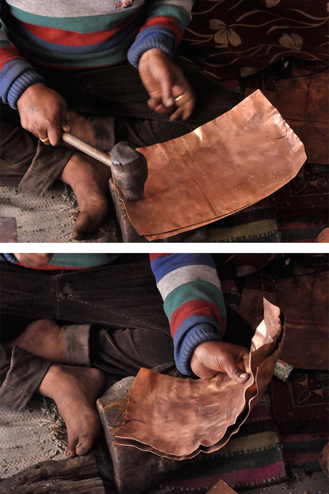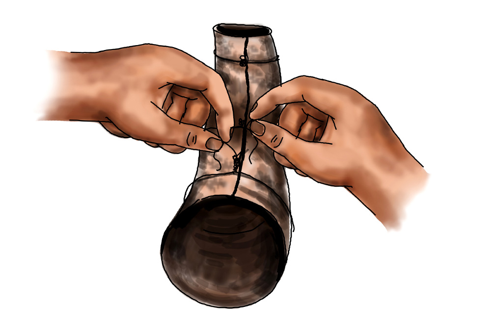 The making process of Ransingha may seem a little old-fashioned with a mixture of copper and bronze pipe, but it’s value is high for over a century. From the ancient kings' age to the average living civilian age, it has been followed by the same tradition and culture. The Ransingha is of 's' shape and made of copper and bronze. The process starts by cutting a copper sheet into the required length. An artisan gets an appropriate shape by hammering the piece of copper sheet. The copper sheet is beaten and brought to form 's' shape with a wide-open hole in the upper end and a narrow hole at the lower end. The stainless steel metal wire is tied accordingly to keep the cylindrical shape firm; then, a metal paste is applied at both ends to stick it for a long-term hold. After that, it is heated on the fire burning by charcoal until the sheet turns completely red. Heating helps in filling the gaps of the ends where the metal paste has been applied. Again the same process is continued for three more joints of this shape. The Bronze sheet is cut accordingly and is hammered in a compact size for making the rings. The rings are carved in traditional design. Five bronze rings are prepared and attached one after another at a certain distance on the pipe. The rings are attached with the help of metal paste, and each ring differs in size. A small circular piece of bronze is fixed as a mouthpiece at the starting point of the Ransingha pipe, which supports blow by mouth. After this procedure, the Ransingha instrument is polished for smoothness. The making process of this instrument takes around five days to get completed. After the process is completed, the metal wire is removed from the instrument.