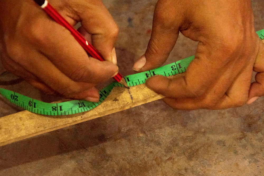 A plain wooden plank is taken on which accurate measurement is drawn and artesian cuts it accordingly with the help of hand saw. A beading wood of about half an inch is measured and cut for framing which is nailed with the help of a hammer. The paintings backdrop is prepared from red or yellow ochre earth or matt enamel paint which is then painted over using brushes and keeps for drying in an open area. Artesian use natural dyes and chromes derived from ground white stone, hued earth, and vermilion and mixtures of tamarind seed, flower and leaf extracts. Sea shell is crushed until it turns to gentle powder which is mixed with fevicol, gondh, water and acrylic paint. A cone is made with the help of butter paper in which artesian pours the paint, seals manually and cuts out the tip for the paint to flow easily. Once the paint is ready, the dried frames are line drawn with the help of pencil and other tools like scale, compass etc. after completing the drawing, artesian starts painting by applying gentle pressure on cone and moving the cone parallel to drawn line. This process required a lot of focus with sharp edges following with a consistency while compressing the cone. After every pencil lines are covered with the paint, artesian then starts to paint human figure in a form of geometrical shapes and abstract looking nature which involves plants, trees, animal and other living objects. After completing the painting, artesian takes a flat brush and paints the boarders with the help of a black enamel paint. The paint takes about 24 hours to be completely dried. Artesian fixed a metal hook which is used to hand on the wall and packs the painting for shipping it to the customer.