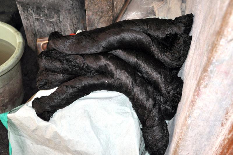 Winding weft: Weft yarn is wound on a metal cylinder from the hank and allowed to soak for two hours. Soaking the weft yarn ensures dense packing of weft and a smooth finish. The weft yarn is wound as the weaving progresses. This is done mostly at home by family members in their free time.