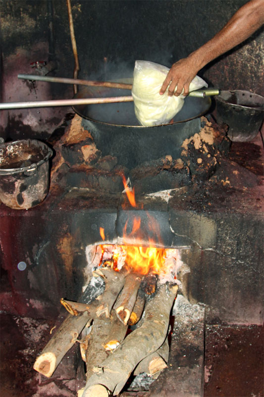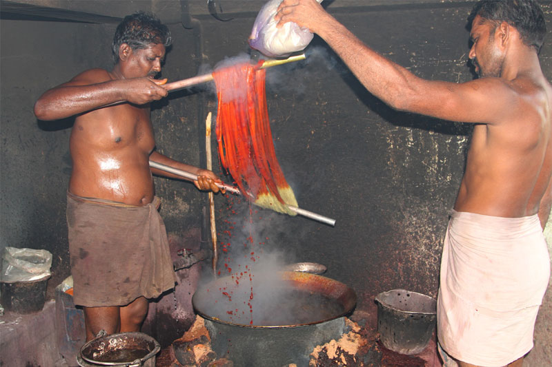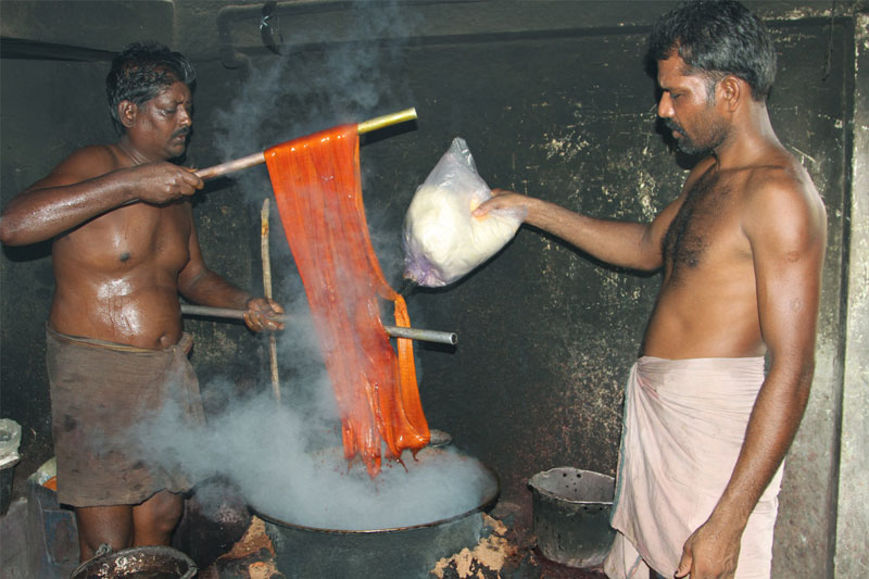 To start dyeing process, water is boiled in a huge copper container. Once water is boiled at high temperature, the dye materials–washing soda, soap oil, dye color are added to the boiling water. The off-white silk yarn is dipped into the colored boiling solution. After dyeing, the colored yarn is immersed normal water to remove excess color. The yarn is taken out from the container and it is allowed to dry for 2 to 3 days. Red, green, blue and mustard are the popular colors used in dyeing process.