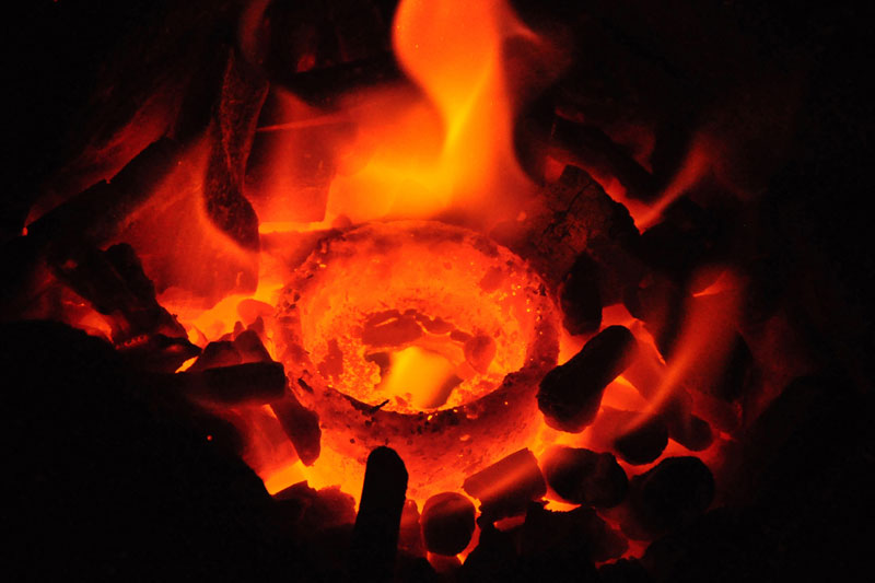 Parts of the article is prepared separately and soldered to join them. Flux is applied on joints and heated to solder the joints. The heated article is dipped in sculpture liquid and then in normal water. It also removes the black coat from the article, thus giving it a glittering effect. The article is then hammered to give the desired shape. The heating and cooling process is repeated for 3 to 4 times in between to strengthen the properties of metal.