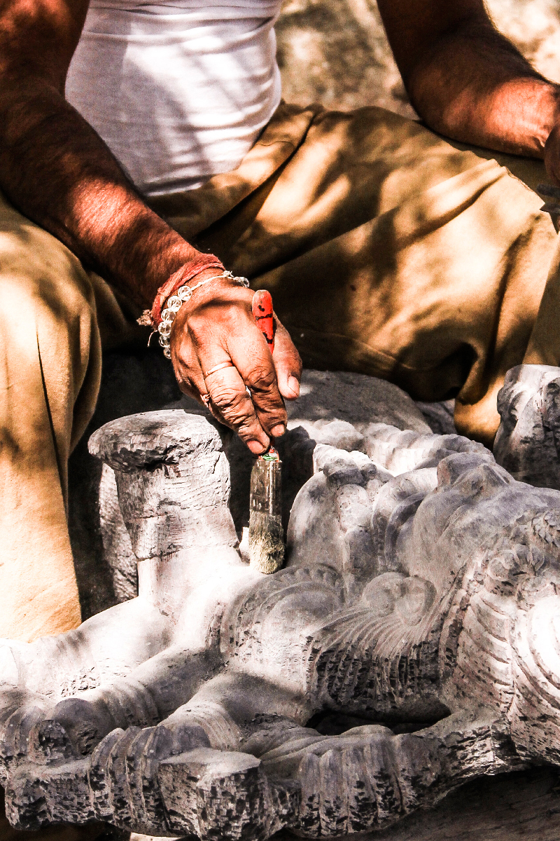 The process begins with the selection of a fine stone for carving. Many artisans use the stone itself as an inspiration. Other artists begin with a form already in mind and find a stone to accomplish their vision. The sculptor begins by forming a model, sometimes sketching the form of the statue on paper or drawing a general outline of the statue on the stone itself. Then begins the roughing out stage where the artist usually begins by knocking off large portions of unwanted stone. By selecting a point chisel, which is a long, hefty piece of steel with a point at one end and a broad striking surface at the other. A pitching tool may also be used at this early stage; which is a wedge-shaped chisel with a broad, flat edge used for scraping off the unwanted stone pieces. The pitching tool is useful for splitting the stone and removing large, unwanted chunks. Those two chisels are used in combination with a hammer. Once the general shape of the statue has been determined, the sculptor uses other tools to refine and improve the figure. Toothed chisel or a claw chisel has multiple extracting surfaces which create parallel lines in the stone. These tools are commonly used to add texture to the figure. An artist might mark out specific lines by using callipers to measure an area of stone, and marking the removal area with pencil, charcoal or chalk or red oxide. The stone carver generally uses a thinner stroke at this point in the process, usually in combination with a wooden mallet.