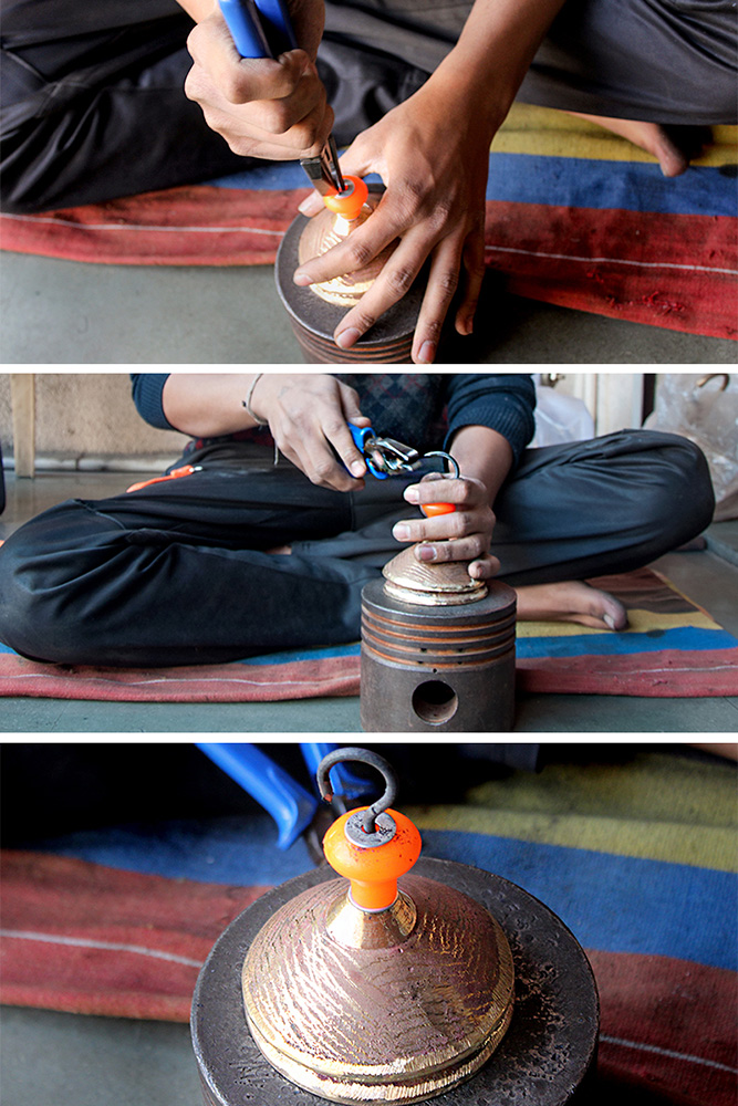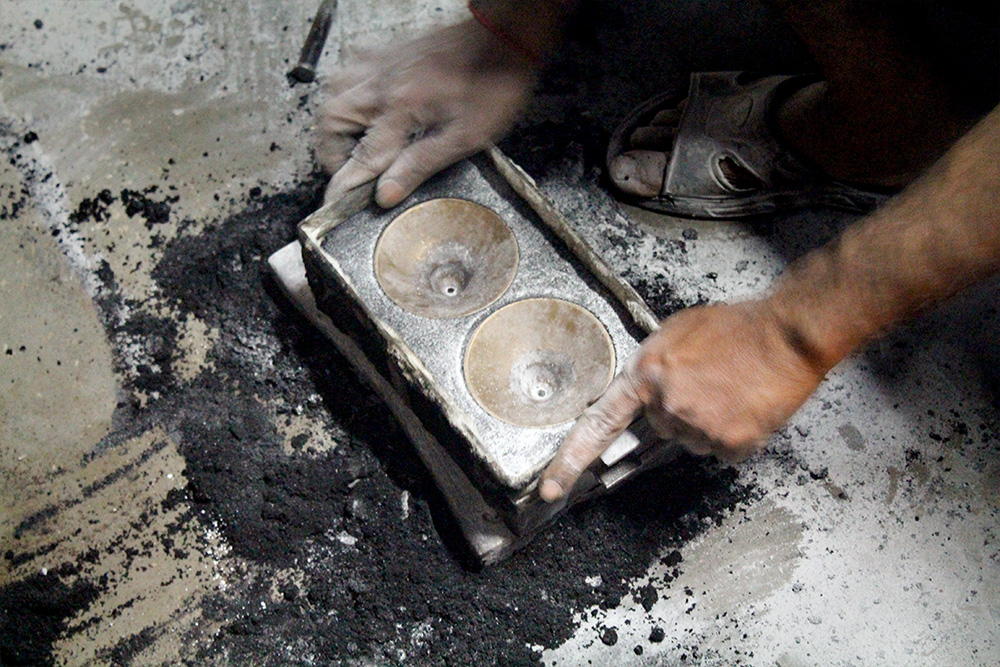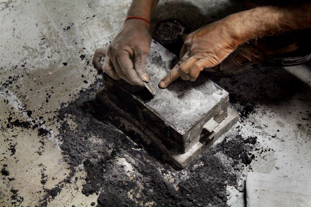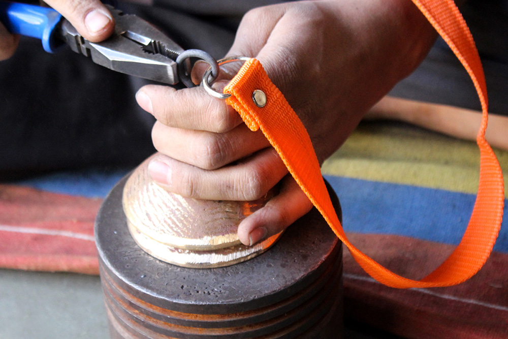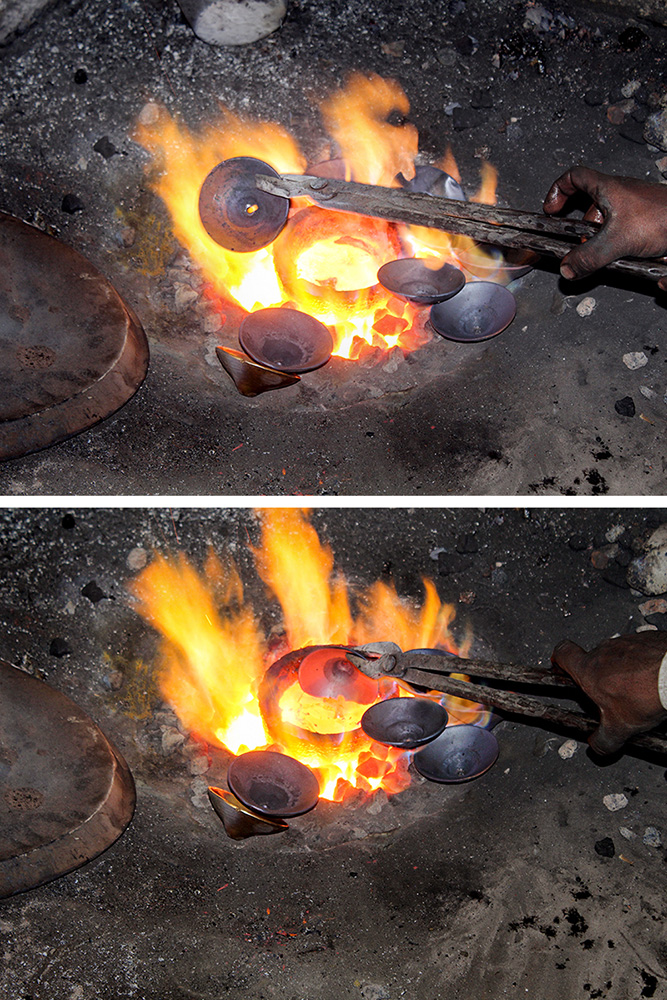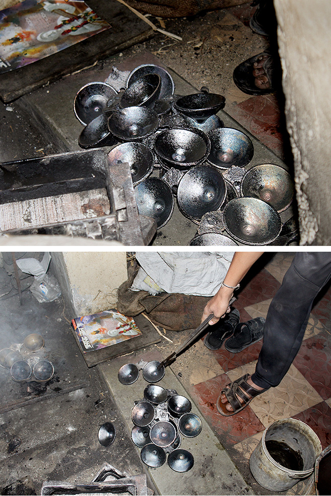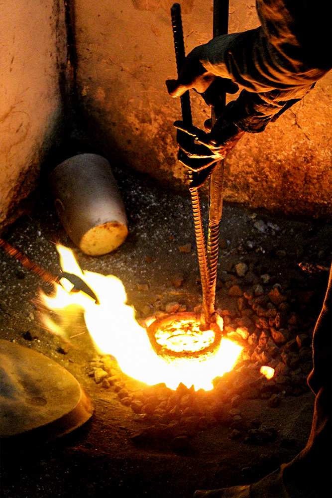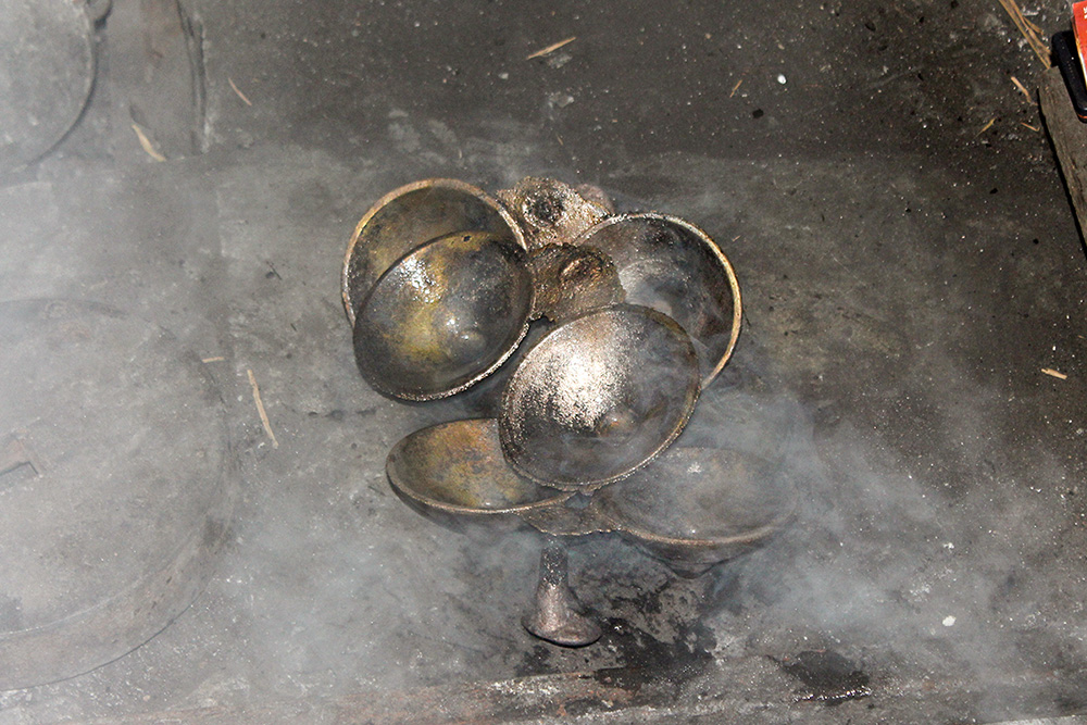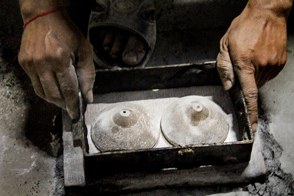A Taal making is put through a sand casting method performed to solidify metal into a particular shape. Firstly a box flask is used to make a mold of Taal shape. Here the box flask is a rectangular structure with only frames and no top or bottom, made up of two parts: a cope and a drag. Placing the drag on the board, the wheat powder is sprinkled over to establish a non-sticky layer. Sand is then filled into the pattern and drag, packing them completely, followed by proper hitting with hand hammers. To have an opening for pouring molten metal, holes are created at this stage in the drag to the full depth of the drag as well as the flask. The finished drag flask is now rolled over to the bottom board exposing the pattern. Again wheat flour is sprinkled all over them. The same steps are followed for cope similarly and once done the pattern is removed from the freshly designed cope and drag. Likewise, many molds are made ready and assembled for large-scale production. Once the mold is ready, metal pieces and wires are placed into a crucible in a burning furnace to melt it at high temperatures. Next, this molten metal in the crucible is carried towards the mold with the help of tongs and poured through the feed hole. After the substance cools and solidifies, its casting is separated from the mold and dipped into the water. A pair of casted shapes is then tied with a cotton strap with the help of a big nail to make a handle for the Taal.