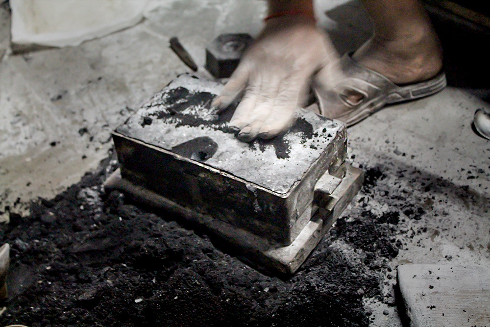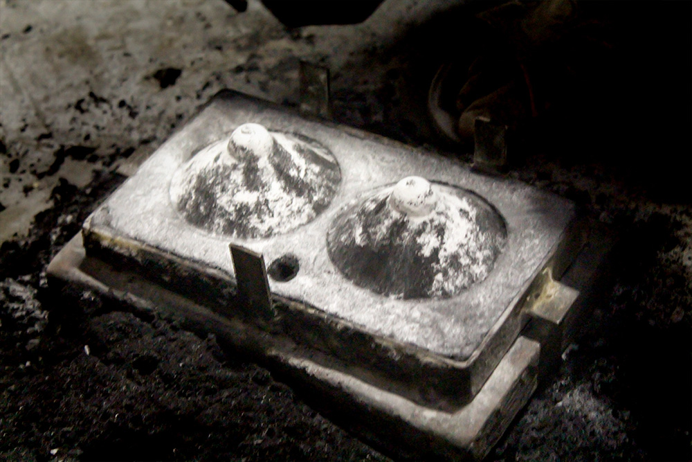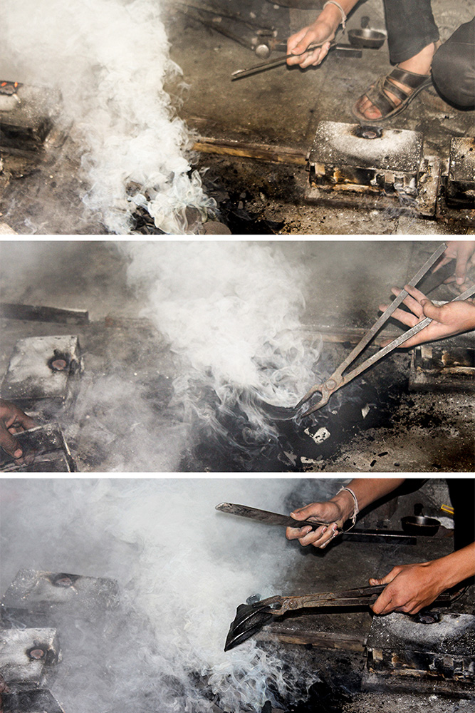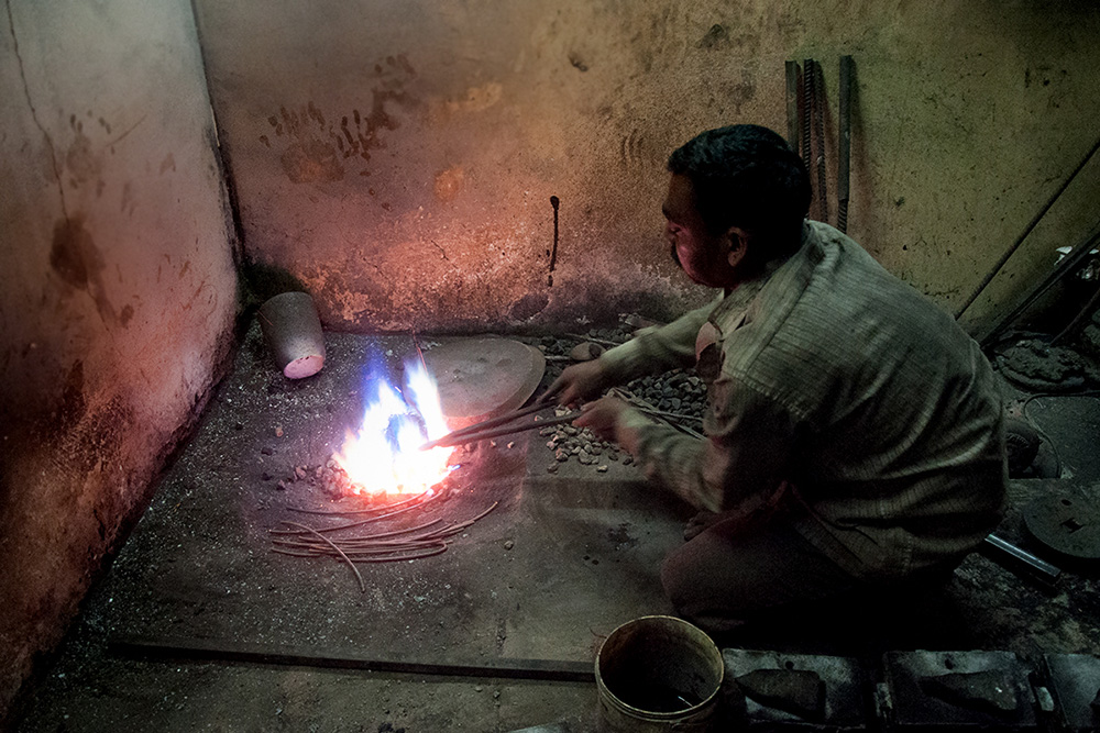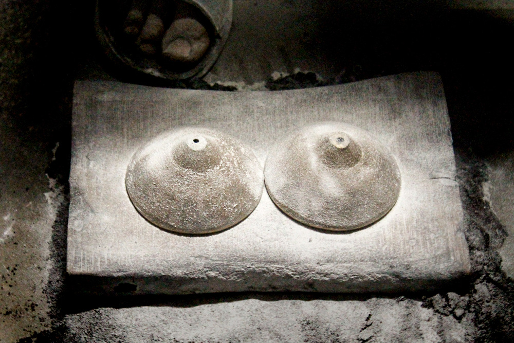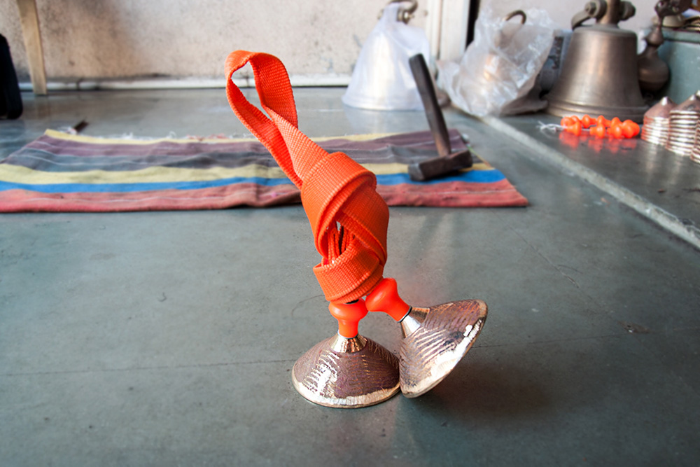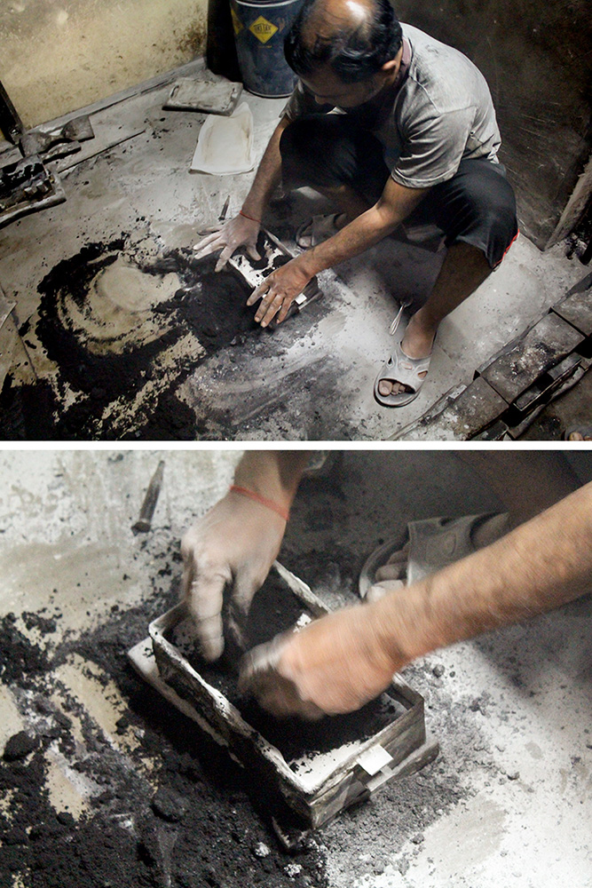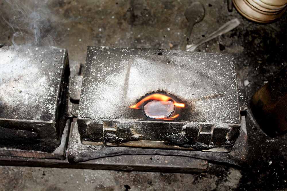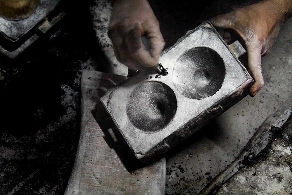 A Taal making is put through a sand casting method performed to solidify metal into a particular shape. Firstly a box flask is used to make a mold of Taal shape. Here the box flask is a rectangular structure with only frames and no top or bottom, made up of two parts: a cope and a drag. Placing the drag on the board, the wheat powder is sprinkled over to establish a non-sticky layer. Sand is then filled into the pattern and drag, packing them completely, followed by proper hitting with hand hammers. To have an opening for pouring molten metal, holes are created at this stage in the drag to the full depth of the drag as well as the flask. The finished drag flask is now rolled over to the bottom board exposing the pattern. Again wheat flour is sprinkled all over them. The same steps are followed for cope similarly and once done the pattern is removed from the freshly designed cope and drag. Likewise, many molds are made ready and assembled for large-scale production. Once the mold is ready, metal pieces and wires are placed into a crucible in a burning furnace to melt it at high temperatures. Next, this molten metal in the crucible is carried towards the mold with the help of tongs and poured through the feed hole. After the substance cools and solidifies, its casting is separated from the mold and dipped into the water. A pair of casted shapes is then tied with a cotton strap with the help of a big nail to make a handle for the Taal.