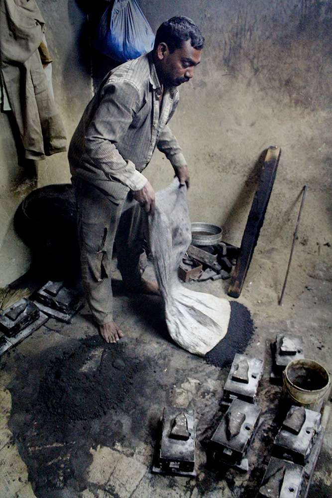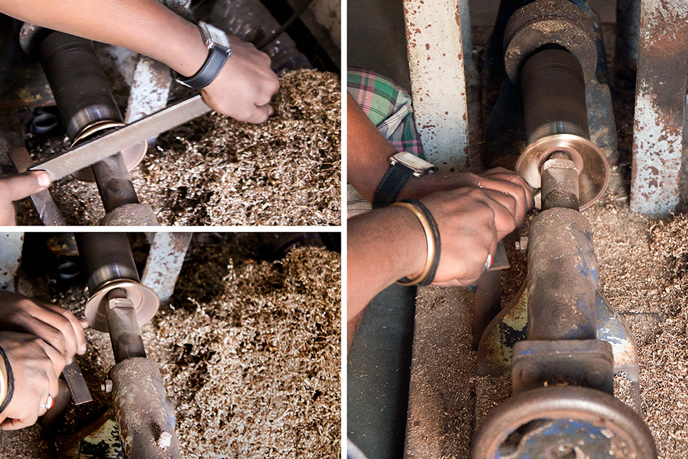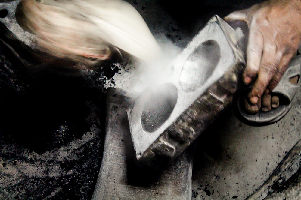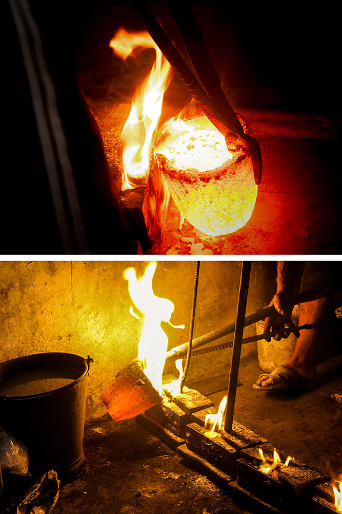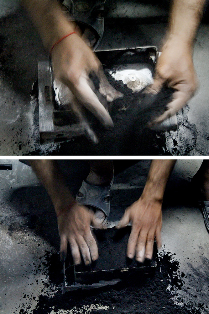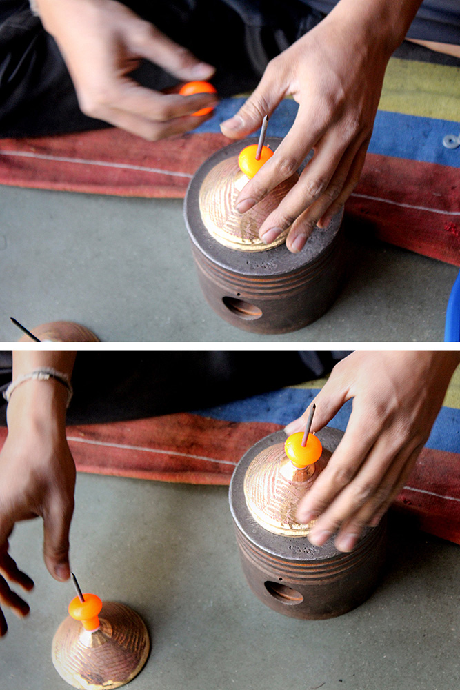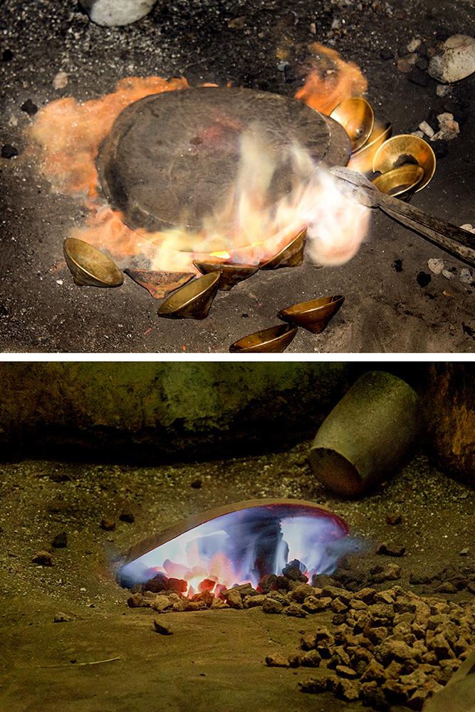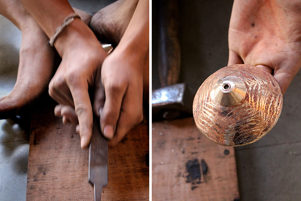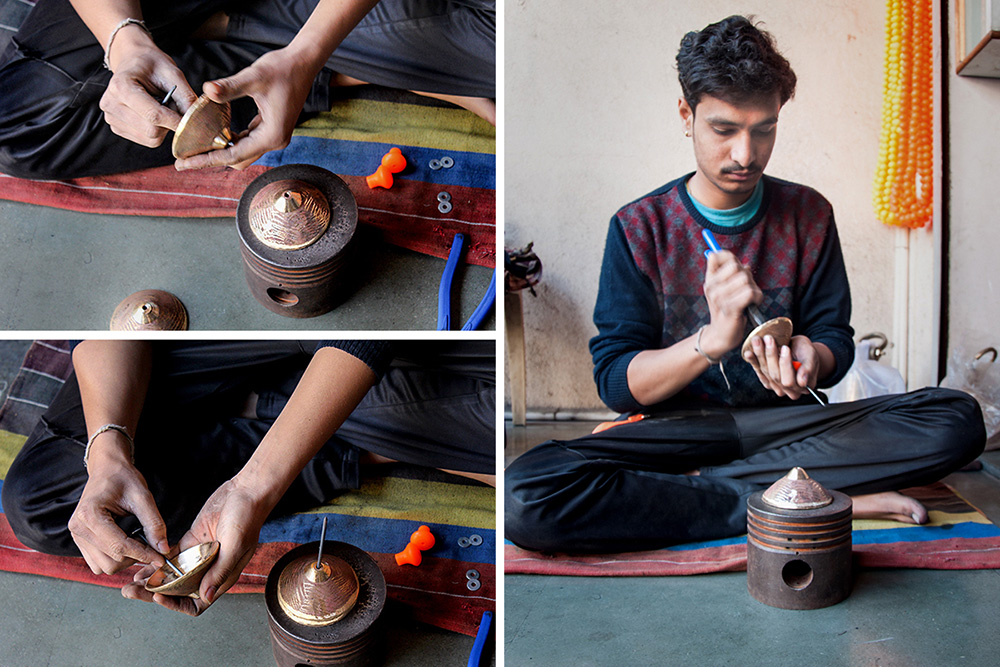 A Taal making is put through a sand casting method performed to solidify metal into a particular shape. Firstly a box flask is used to make a mold of Taal shape. Here the box flask is a rectangular structure with only frames and no top or bottom, made up of two parts: a cope and a drag. Placing the drag on the board, the wheat powder is sprinkled over to establish a non-sticky layer. Sand is then filled into the pattern and drag, packing them completely, followed by proper hitting with hand hammers. To have an opening for pouring molten metal, holes are created at this stage in the drag to the full depth of the drag as well as the flask. The finished drag flask is now rolled over to the bottom board exposing the pattern. Again wheat flour is sprinkled all over them. The same steps are followed for cope similarly and once done the pattern is removed from the freshly designed cope and drag. Likewise, many molds are made ready and assembled for large-scale production. Once the mold is ready, metal pieces and wires are placed into a crucible in a burning furnace to melt it at high temperatures. Next, this molten metal in the crucible is carried towards the mold with the help of tongs and poured through the feed hole. After the substance cools and solidifies, its casting is separated from the mold and dipped into the water. A pair of casted shapes is then tied with a cotton strap with the help of a big nail to make a handle for the Taal.