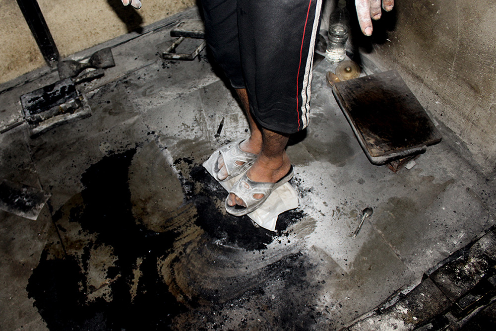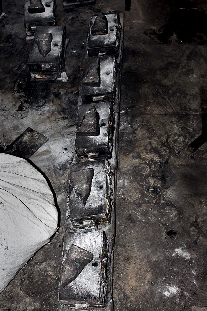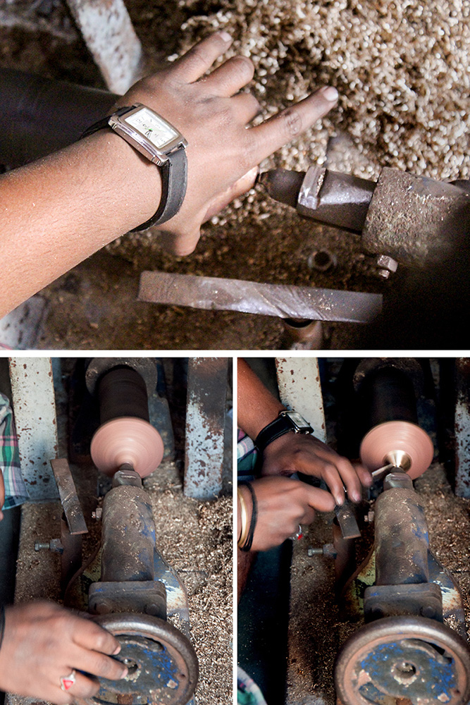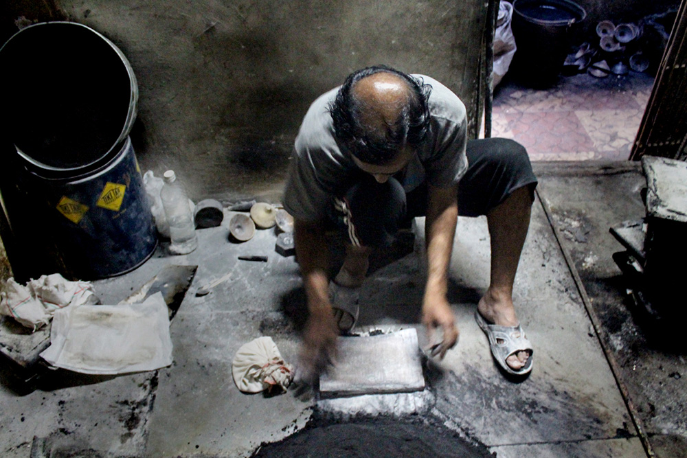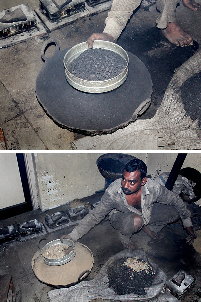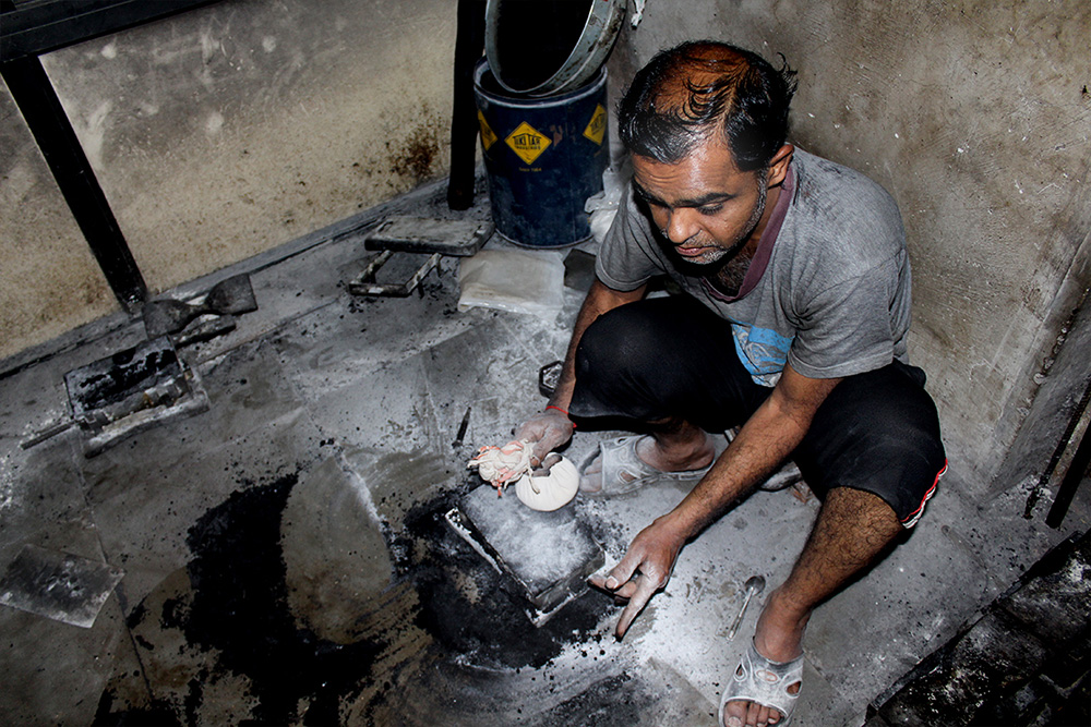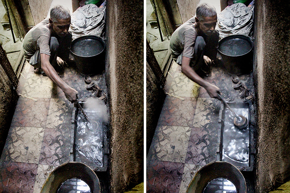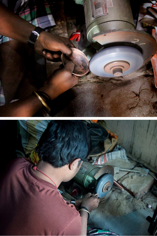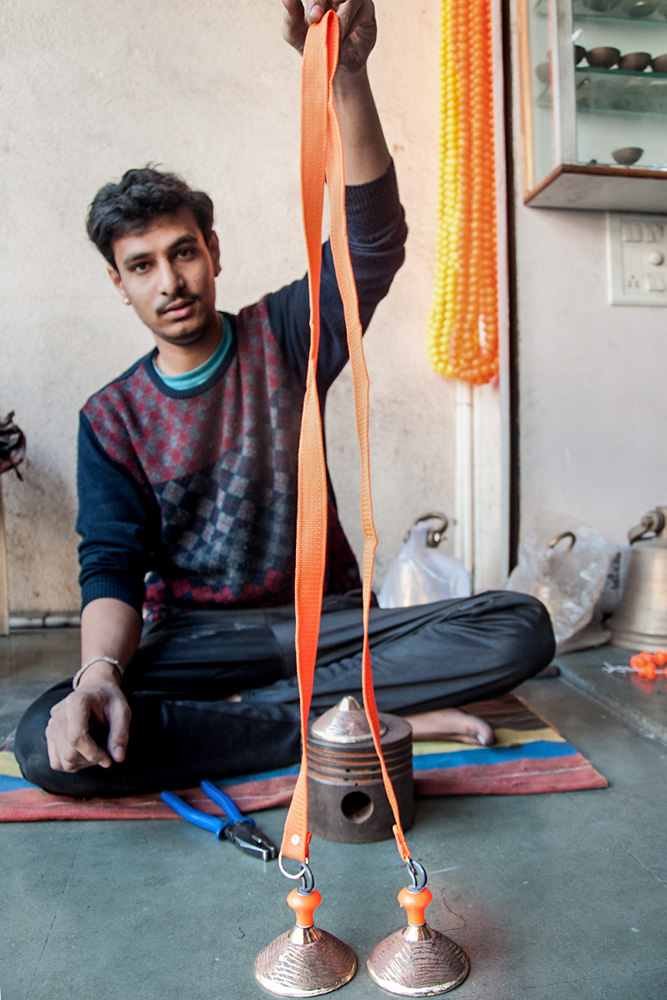 A Taal making is put through a sand casting method performed to solidify metal into a particular shape. Firstly a box flask is used to make a mold of Taal shape. Here the box flask is a rectangular structure with only frames and no top or bottom, made up of two parts: a cope and a drag. Placing the drag on the board, the wheat powder is sprinkled over to establish a non-sticky layer. Sand is then filled into the pattern and drag, packing them completely, followed by proper hitting with hand hammers. To have an opening for pouring molten metal, holes are created at this stage in the drag to the full depth of the drag as well as the flask. The finished drag flask is now rolled over to the bottom board exposing the pattern. Again wheat flour is sprinkled all over them. The same steps are followed for cope similarly and once done the pattern is removed from the freshly designed cope and drag. Likewise, many molds are made ready and assembled for large-scale production. Once the mold is ready, metal pieces and wires are placed into a crucible in a burning furnace to melt it at high temperatures. Next, this molten metal in the crucible is carried towards the mold with the help of tongs and poured through the feed hole. After the substance cools and solidifies, its casting is separated from the mold and dipped into the water. A pair of casted shapes is then tied with a cotton strap with the help of a big nail to make a handle for the Taal.