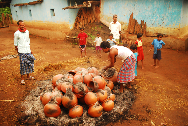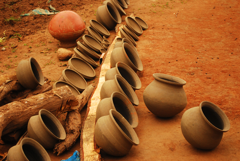 Potters use black and red clay for making terracotta products. The reason behind using black clay is that it is used for fashioning pots and figures and has flexibility to assume any form. The clay is collected from riverbanks and lakeshores. It is mixed with sand and then kneaded by feet to make it smooth. Then small lumps are made. Votive terracotta figures are hollow and created with cylinders and pots of various shapes. Potters throw cylindrical form of clay lumps on wheel to form the limbs, body, neck and head, and these are then joined together to assume the final form. The joining of these parts reveals the mastery of this craft. For joining legs, potters place four legs on the ground in the final position with a carefully measured space in between both the pairs. They place the extended jar-shaped body on the legs with the bigger opening towards the back. Then by piercing a hole in the body and by putting his right hand inside accurately over each leg, they join all the legs. The other parts i.e. neck and head are also joined in a similar manner. On completion of this process the work of decoration begins. As a tradition of offering votive elephant on fulfillment of wish, potters ornate elephant highly with coil decorations covering the whole of their face and back. They are further decorated with rows of small bells. On completion, it is kept under the sun for drying.