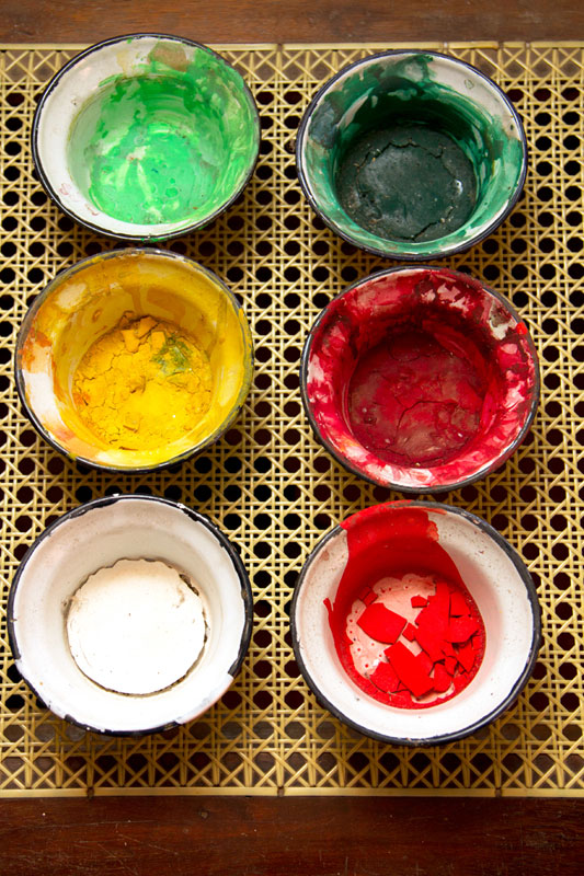 Mai (Soot from vellakanni deepam): Used for preliminary outlining with brush. Also used for detailing the gold leaf embossing.