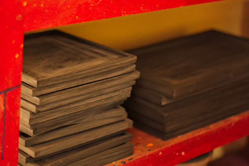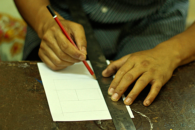 The wooden items are made into desired shape and sanded for even surface. Wooden article are coated with natural colors as the base color (primary coating) and sanded. Colors like white, black, red, orange and blue are commonly used to paint the wooden surface. This method is repeated for 3 times and the painted item is kept under diffused sun light for 2 days. About 7-8 Kgs of natural colors are required in a month. Motifs and art work is drawn on a white sheet, the back side of the sheet (not drawn area) is sprayed with natural white color, which does not stick to the paper but forms a thin layer on the surface of paper. The paper is then temporally fixed on to the wooden article and traced using a pen, the color powder leaves an outline print on the wooden surface.