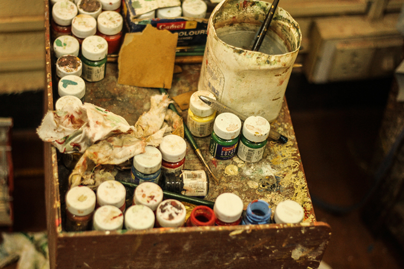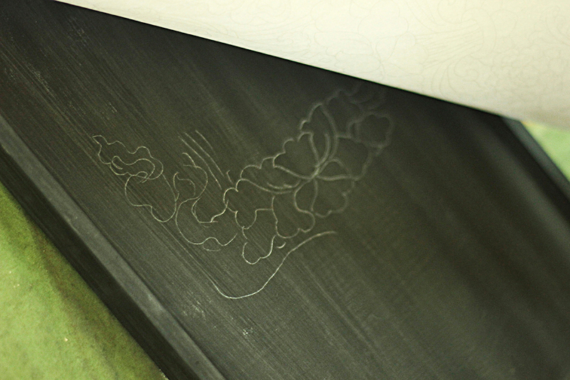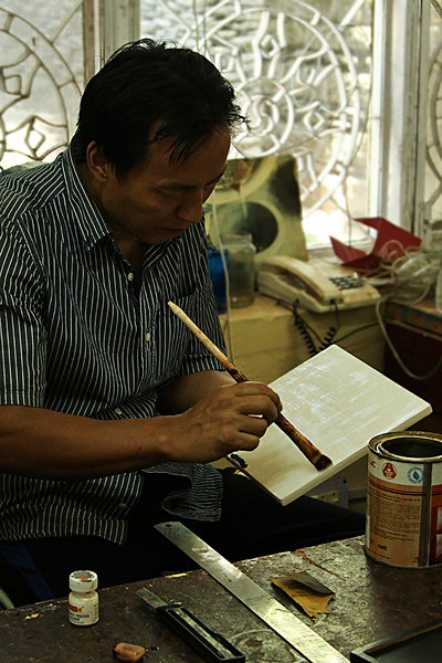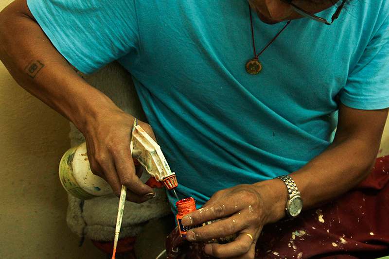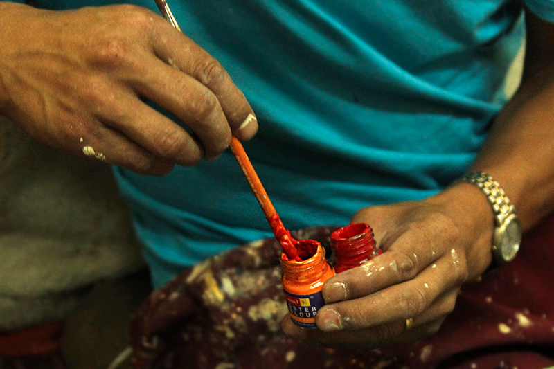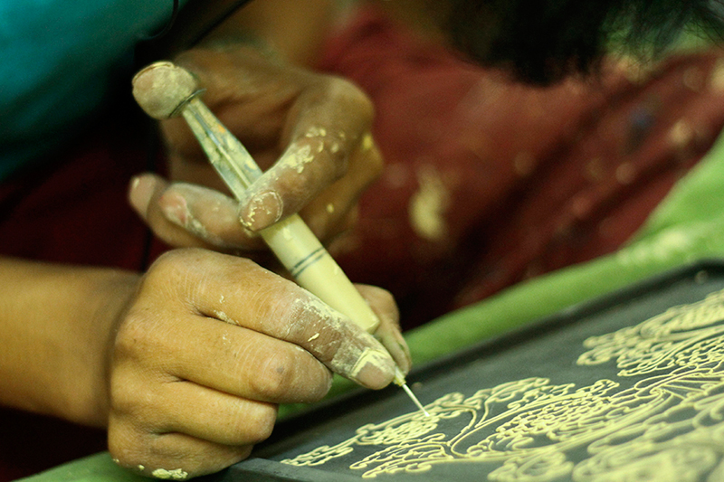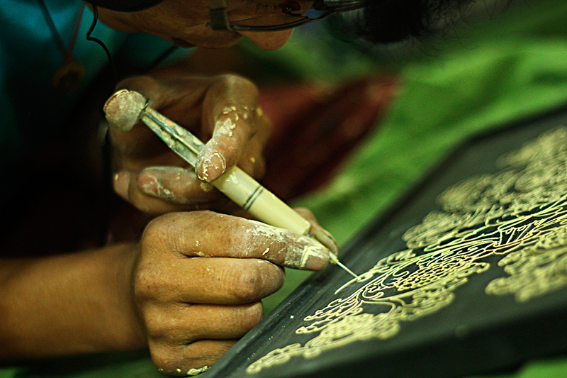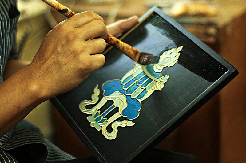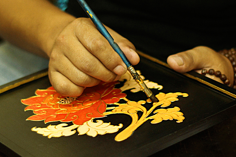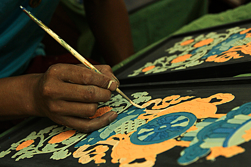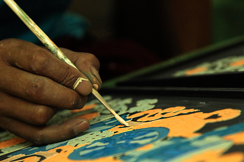 Mixture made up of distemper (white or cream color) and glue is prepared, which is filled in the plastic syringe with needle, with the application of enough pressure, the mixture comes out uniformly through the needle, which is guided on to the outline of traced article. The outline of traced design is fully covered with distemper and glue mixture and kept in room temperature for 2 days to set. Dried article is coated with varnish for a matte finish. The area inside the outline is filled with oil based color, bright colors are chosen to highlight the features. Artisan uses brushes of 3 different size, known as chebir (in local language) -pointed brush size of zero, chubir (in local language) -pointed brush size of number 4 and tangbir (in local language) -flat tip brush of size of number 10. Chubir is used to fill the color and with help of tangbir gradient (color merging effect) is created. Once the colors are dried, using chebir, the outline is coated with pure gold paint. Once the paint is dried, it is coated with varnish for glossy finish and for some special painting mustard oil is used for polish.