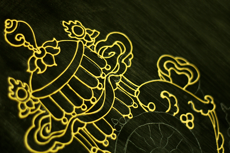 Large scaled serpentine like figures with clawed feet, the dragon represents the primordial force of nature, holder of wisdom and longevity. Dragons are associated with water and are bringers of rain, announcing its coming through its thunderous roar. Often represented on brocade and banners they are also found painted on temple walls, carved into beams and woven into carpets.