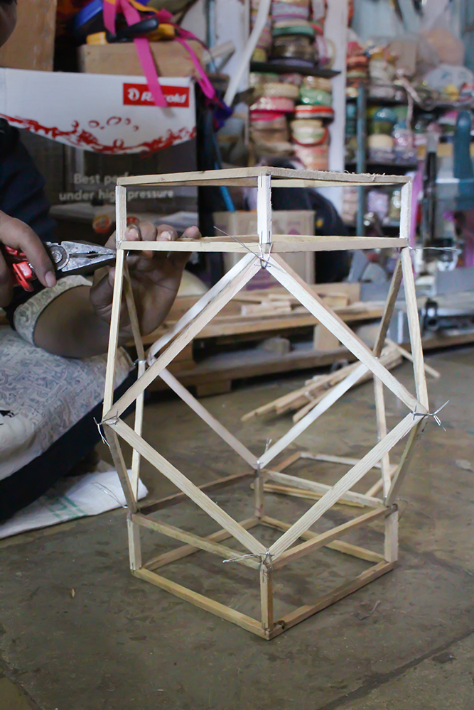Wooden sticks are cut into smaller pieces with the required length. The length of the wooden sticks depends on the size of the lantern to be made.