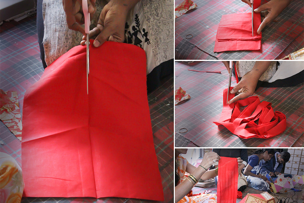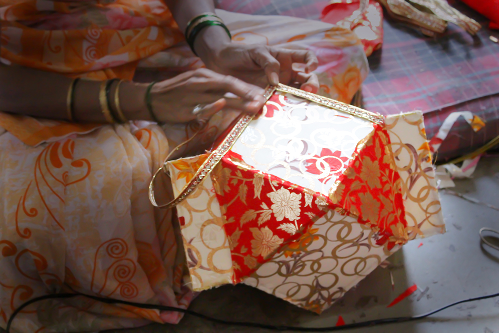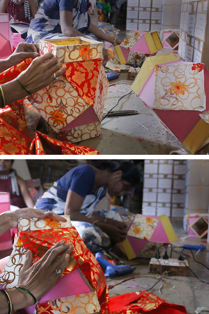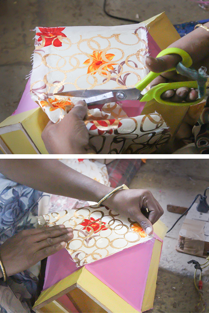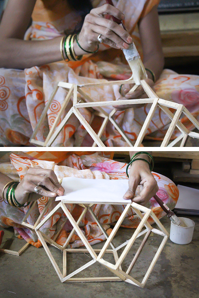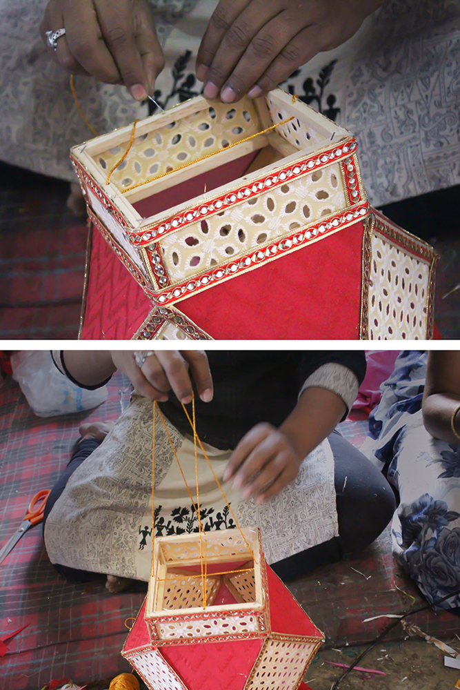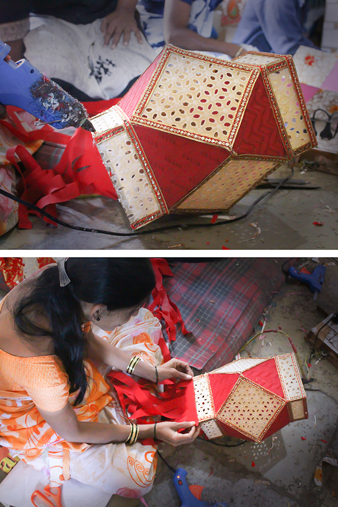 Thus the wooden armature of the traditional Indian lantern is prepared. On this armature is the desired color papers are stuck. Upon these papers are the beautifully printed fabric pieces are stuck. According to the design complementing colored fabric pieces or the color fabrics that carry the harmony of the product are stuck on the paper. These are stuck by using synthetic stick gum gun. Further as per the design, at every corner of triangle/square various designer laces are stuck and frills are created. These frills are either done using paper or fabric that enhances the beauty of the Indian traditional lantern.