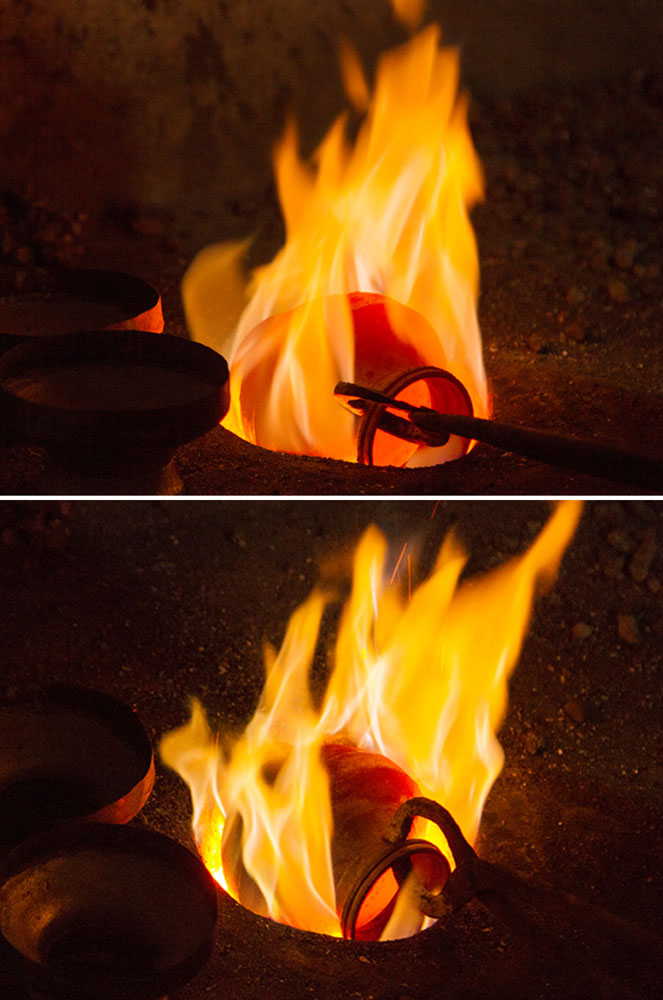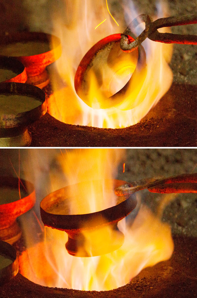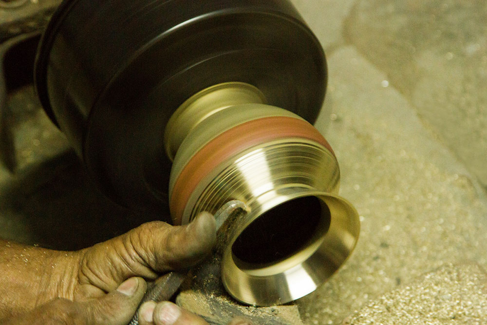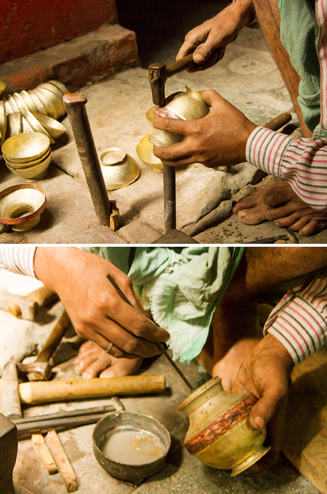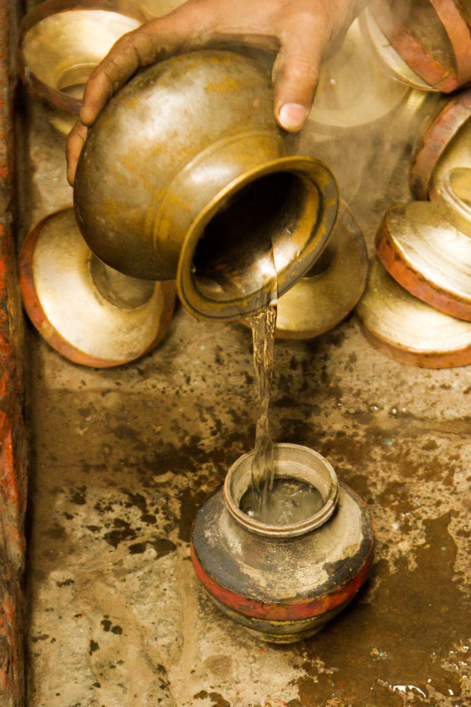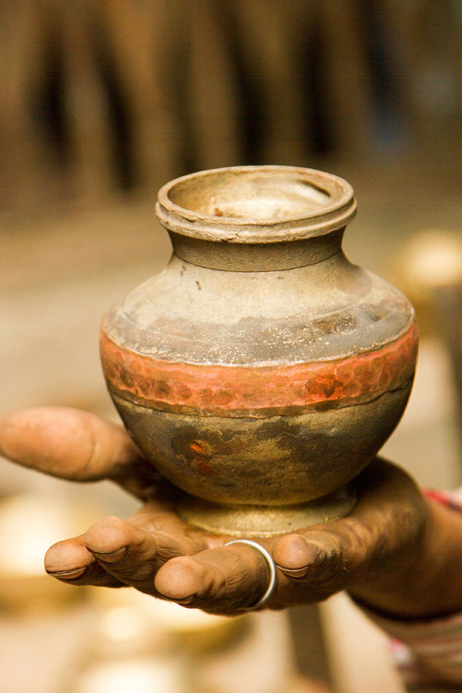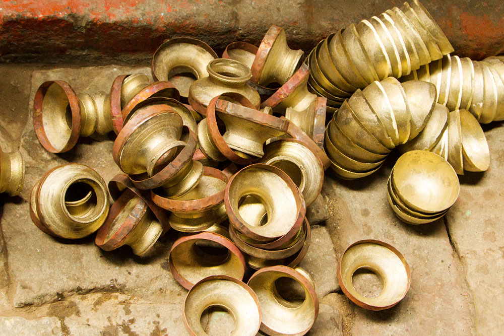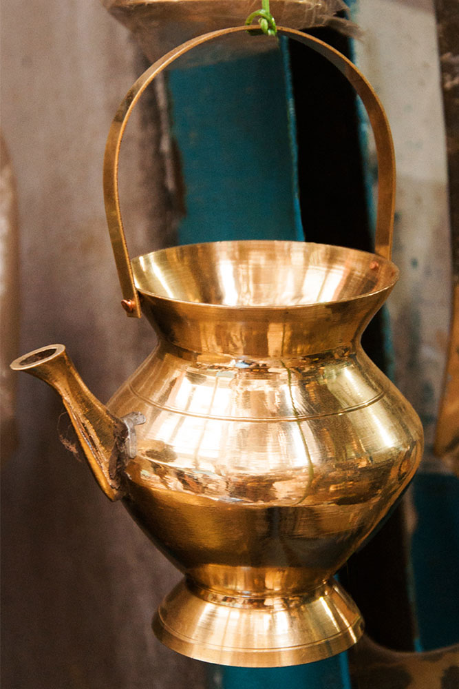 To prepare a brass Kamandalu, initially the scrap brass pieces are allocated and heated in a furnace. The heated brass, which is of liquid form is poured into the pitcher mold and allowed it to form a solid shape. And then the mold is detached from the brass pitcher. Sometimes when the Kamandalu is made in the combination of brass and copper, the top mouth portion and the below portion in the shape of a cup is made of brass using the two different molds. Then the thick copper sheet is cut and welded according to the required measurement and joined in-between the upper and lower parts of the brass Kamandalu. Initially the upper mouth portion of Kamandalu made of brass is fixed to the copper ring by hammering it and shaping it. The gap between the brass and copper is filled by painting the liquid mixer of brass powder and brazing flux powder as a binding agent and heated in the furnace. Once the Kamandalu’s middle portion of copper and the top brass portion of Kamandalu is attached firmly by fixing and heating, it is allowed to cool for some time. Then the down brass part of Kamandalu is attached in the same way to the other side of the copper and heated in furnace and cooled. When it is only the brass Kamandalu then once the pitcher mold is taken, it is allowed for cooling and then it is neatly polished by the polishing machine. After the pitcher is ready a hole is made according to the requirement, in the area where the snout has to be attached. A brass snout is also made by using a mold and is polished. And then it is attached to the pitcher and the mixer of brass powder and brazing flux powder is applied and heated and then buffed completely. A thick sheet of brass is cut accordingly and attached in a semicircular manner at the mouth of the Kamandalu’s either sides as a handle. Thus the traditional brass Kamandalu is prepared and sold at Varanasi.