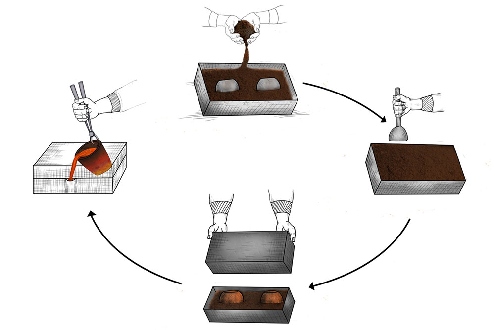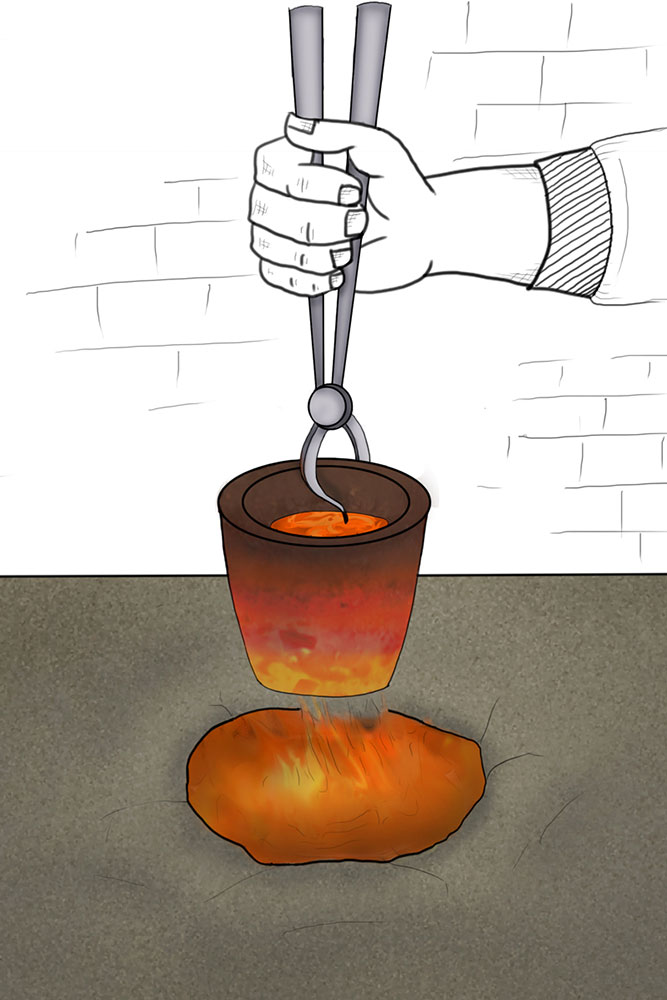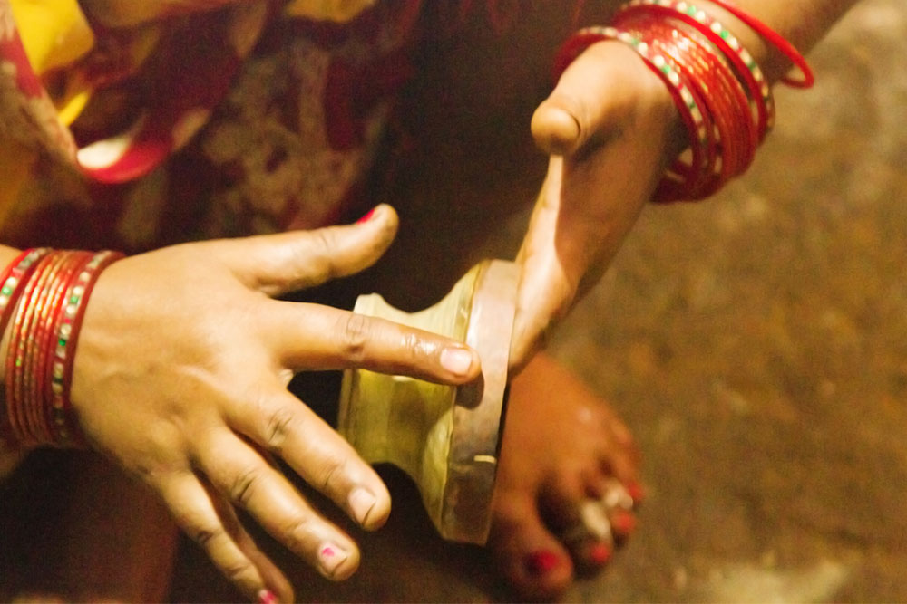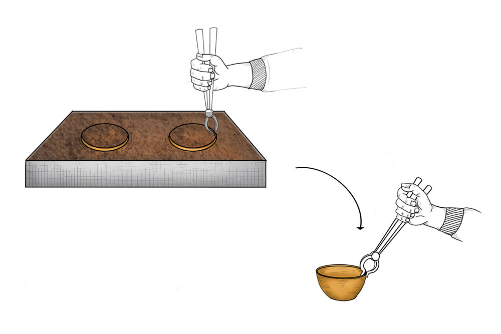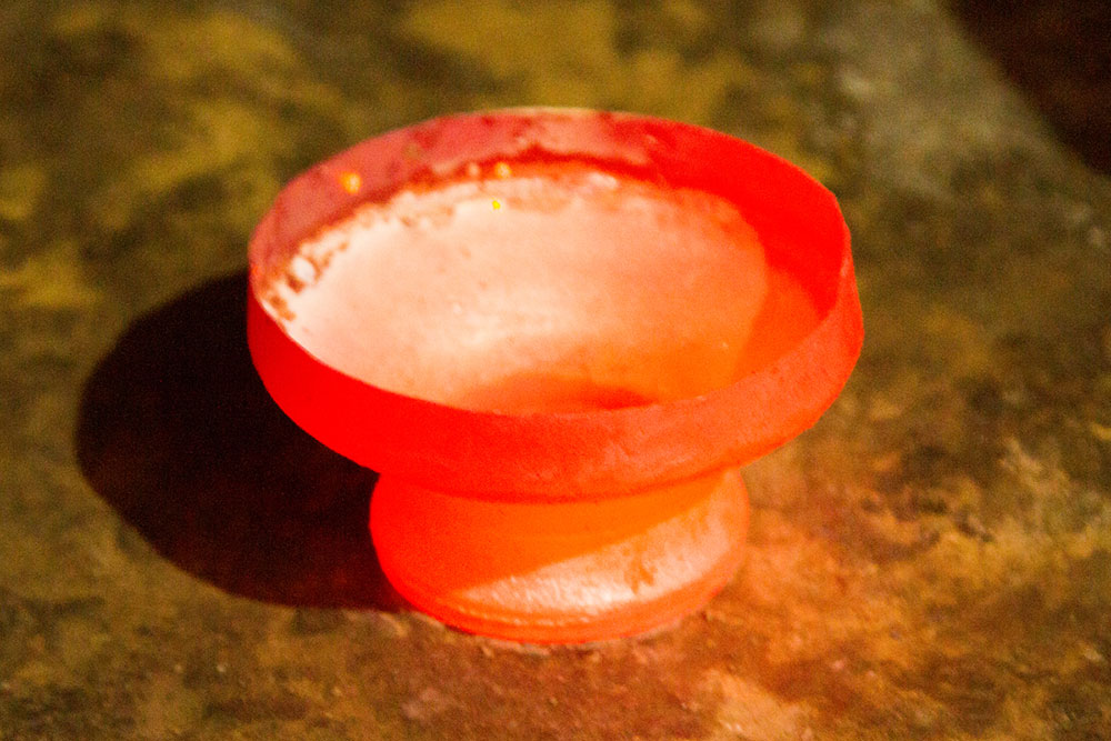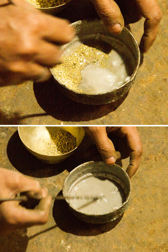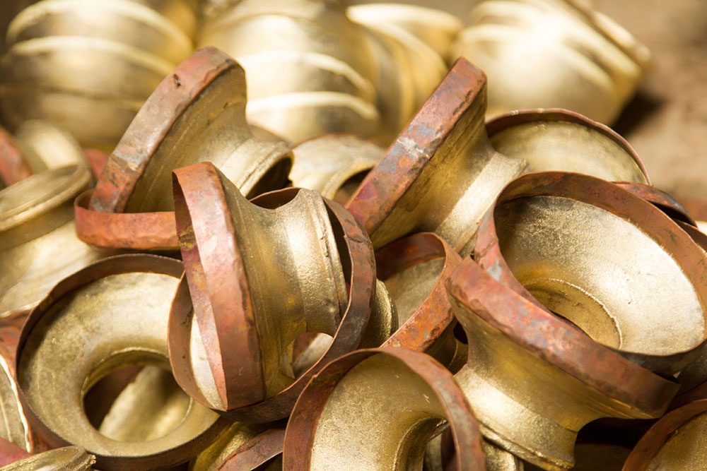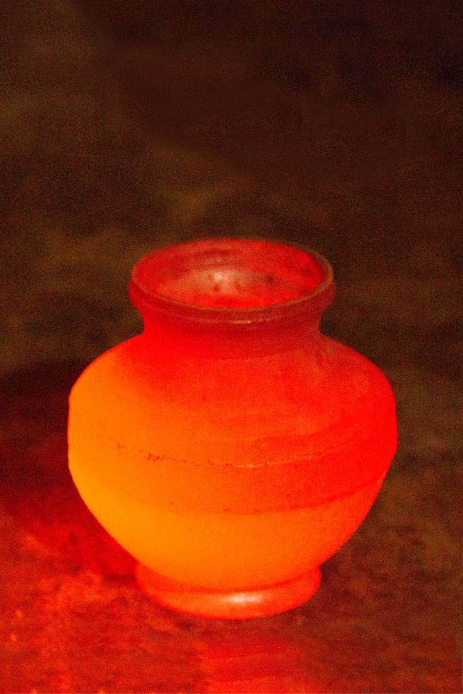 To prepare a brass Kamandalu, initially the scrap brass pieces are allocated and heated in a furnace. The heated brass, which is of liquid form is poured into the pitcher mold and allowed it to form a solid shape. And then the mold is detached from the brass pitcher. Sometimes when the Kamandalu is made in the combination of brass and copper, the top mouth portion and the below portion in the shape of a cup is made of brass using the two different molds. Then the thick copper sheet is cut and welded according to the required measurement and joined in-between the upper and lower parts of the brass Kamandalu. Initially the upper mouth portion of Kamandalu made of brass is fixed to the copper ring by hammering it and shaping it. The gap between the brass and copper is filled by painting the liquid mixer of brass powder and brazing flux powder as a binding agent and heated in the furnace. Once the Kamandalu’s middle portion of copper and the top brass portion of Kamandalu is attached firmly by fixing and heating, it is allowed to cool for some time. Then the down brass part of Kamandalu is attached in the same way to the other side of the copper and heated in furnace and cooled. When it is only the brass Kamandalu then once the pitcher mold is taken, it is allowed for cooling and then it is neatly polished by the polishing machine. After the pitcher is ready a hole is made according to the requirement, in the area where the snout has to be attached. A brass snout is also made by using a mold and is polished. And then it is attached to the pitcher and the mixer of brass powder and brazing flux powder is applied and heated and then buffed completely. A thick sheet of brass is cut accordingly and attached in a semicircular manner at the mouth of the Kamandalu’s either sides as a handle. Thus the traditional brass Kamandalu is prepared and sold at Varanasi.