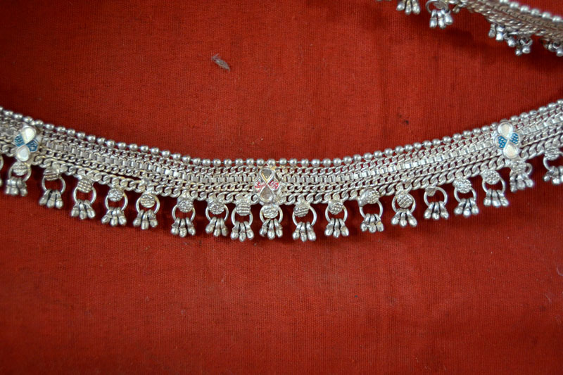 The adivasisare a huge fan of ornaments, especially chunky metallic jewelry. The range consists of various types of earrings, chains, chokers, bangles, anklets, toe-rings and hair ornaments of traditional design, some highly priced and some other cheaper. Silver ornaments are sometimes coated with enamel work, which gives them an attention-grabbing look. ‘Hansuli' (necklace) and anklets of clove shape are some of the distinguished pieces. The anklets are usually made of silver beads and cast in one piece that is called ‘lauangkasauthi’. These ornaments are as popular among the men as they are with the women. Tikamgarh, Jhabua and Sheopur-Kalan are the hubs for this art.