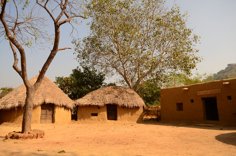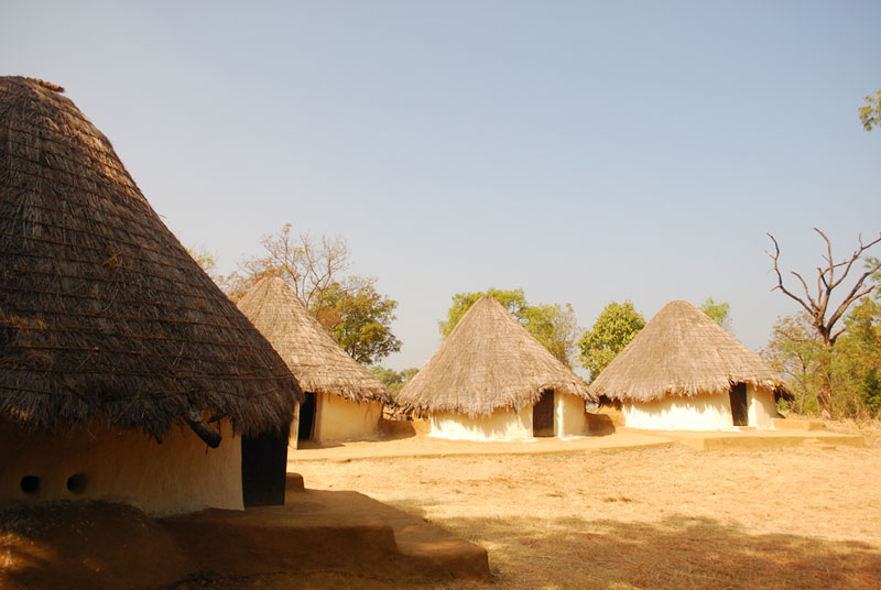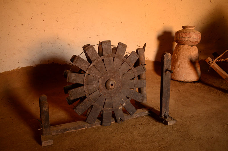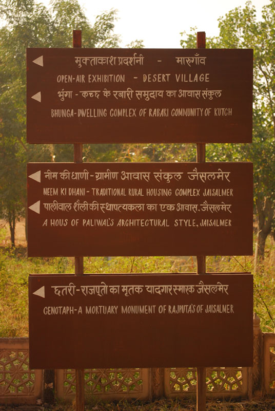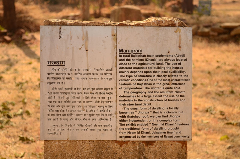 Typical dwelling types from Jaisalmer in Rajasthan, and Kutch in Gujarat are exhibited under the desert village display. The stone architecture of Rajasthan, with huge size stones and chhatris, depicting the elements of pride and honor in Rajput architecture, has been exhibited in similar way. The bhungas (circular huts) with its marvelous clay and mirror work demonstrate the ecological, social and the aesthetic aspects of the nomadic Rabari people of Kutch, Gujarat. Thus desert village exhibit features the process, and the extent of their adaptation to the environment. The entire village has been displayed with various ethnographic objects that reflect the life style and the actuality of the dwelling populations.