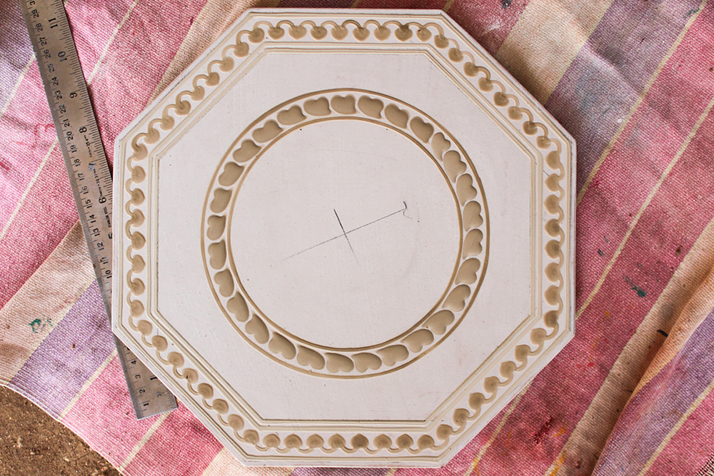 An ordinary wooden slab (chatris or palkis) is used to make Kinnal art. They are cut into circle, square or octagon shape. The process starts by applying mixture of chalk powder and gum and is applied evenly on the wooden slab as a base. This is kept for drying for some time. After it is dried, the surface is rubbed on by sandpaper to make it smooth for painting. Artisan uses scale, pencil and diameter to draw the borders on the slab. Gesso work is made on the borders and in the middle of the wooden piece. Gesso is a compound made of chalk powder and gum and distemper colour. The gesso work is basically made on the borders or in the center of the canvas. The designs are surrounded with flowers and leaves, with any mythological character in the middle and dried (chalk powder). After this is completely dry, silver foil is cut as per the required form and pasted evenly on top of the gesso work with the help of a brush and adhesive.