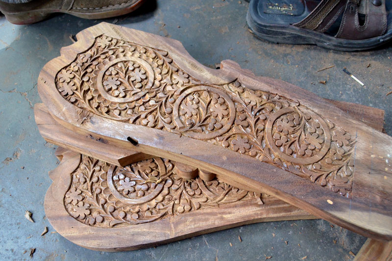 Carving is done either completely by hand or in combination with an electric saw. The saw is usually employed to make geometric patterns in wooden boxes. The whole operation is started by drawing the pattern intended to be carved on a piece of paper and pasting it over the surface. Holes are drilled to precisely (and quickly) carve out the negative spaces.